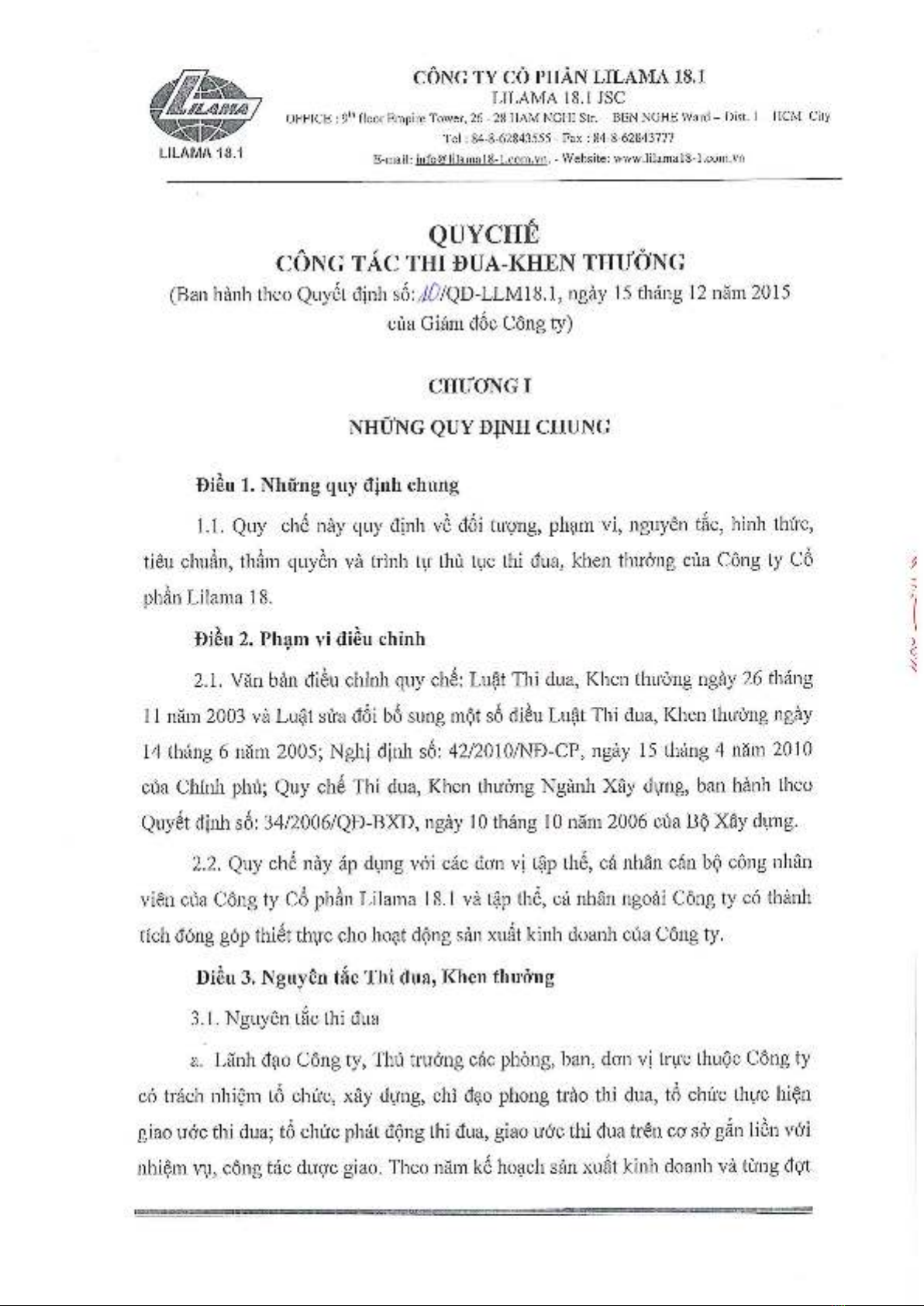 Quy chế này quy định về đối tượng, phạm vi, nguyên tắc, hình thức, tiêu chuẩn, thẩm quyền và trình tự thủ tục thi đua, khen thưởng của Công ty Cổ phần Lilama 18.1. Quy chề này áp dụng với các đơn vị tập thể, cá nhân cán bộ công nhân viên của Công ty Cổ phần Lilama 18.1 và tập thể, cá nhân ngoài công ty có thành tích đóng góp thiết thực cho hoạt động sản xuất kinh doanh của công ty.
