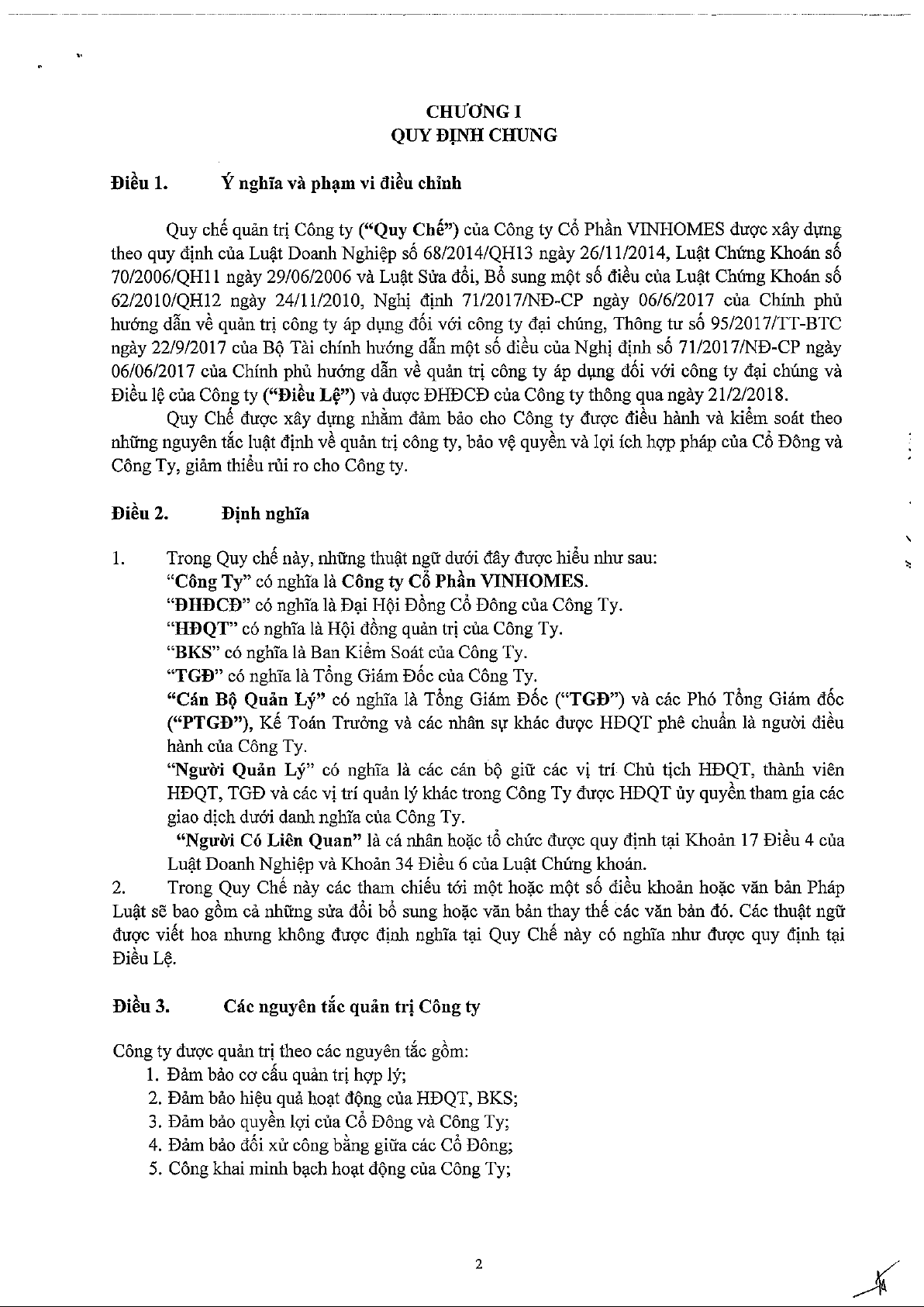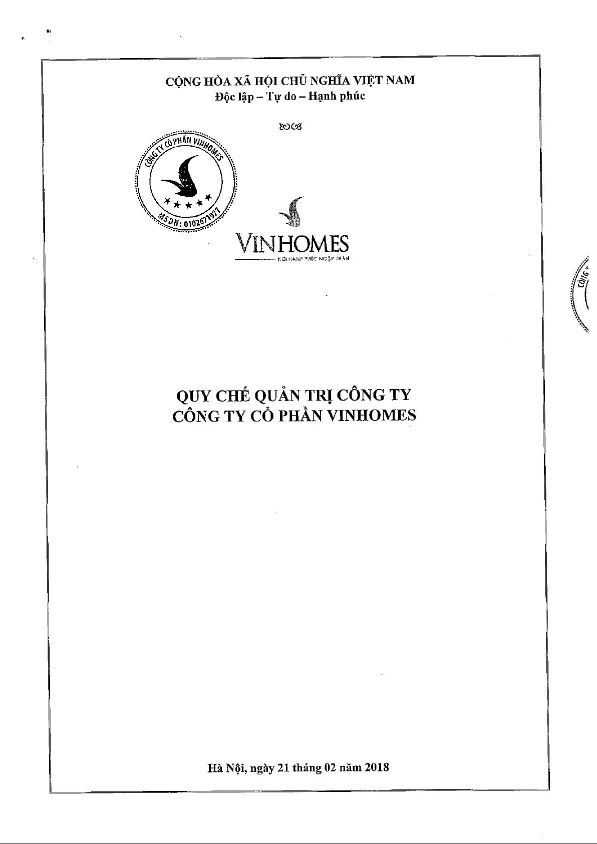 Quy chế quản trị công ty ("Quy chế") của Công ty Cổ phần VINHOMES được xây dựng theo quy định của Luật Doanh Nghiệp sô 68/2014/QH13 ngày 26/11/2014, Luật Chức Khoán số 62/2010/QH12 ngày 24/11/2010, Nghị định 71/2017/NĐ-CP ngày 06/6/2017 của Chính phủ hướng dẫn về quản trị công ty áp dụng đối với công ty đại chúng, Thông tư số 95/2017/TT-BTC ngày 22/9/2017 của Bộ Tài chính hướng dẫn một số điều của Nghị định số 71/2017/NĐ-CP ngày 06/06/2017 của Chính phủ hướng dẫn về quản trị công ty áp dụng đối với công ty đại chúng và Điều lệ của Công ty ("Điều lệ") và được ĐHĐCĐ của Công ty thông qua ngày 21/2/2018. Quy chế được xây dựng nhằm đảm bảo cho Công ty được điều hành và kiểm soát theo những nguyên tắc luật định về quản trị công ty, bảo vệ quyền và lợi ích hợp pháp của Cổ Đông và Công ty, giảm thiểu rủi ro cho Công ty.