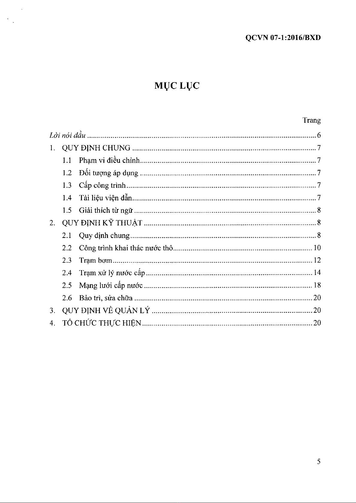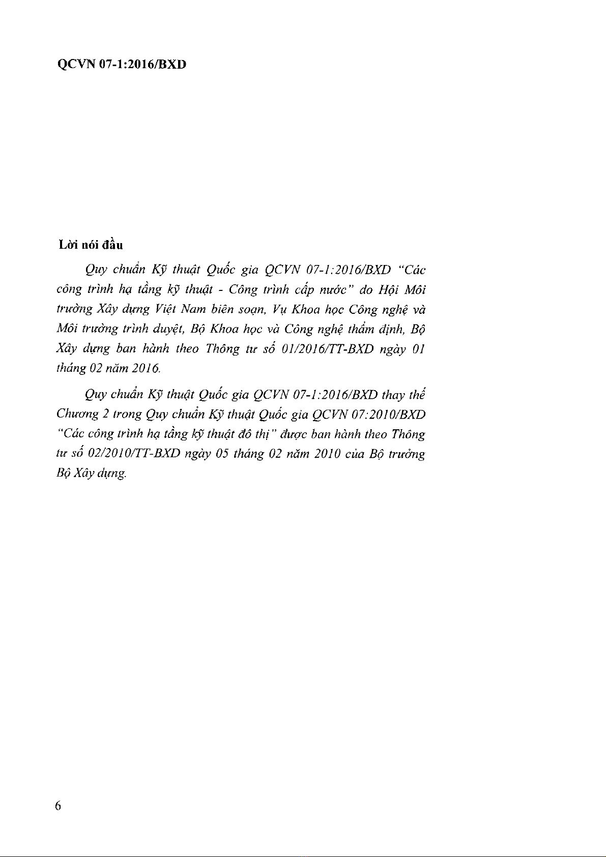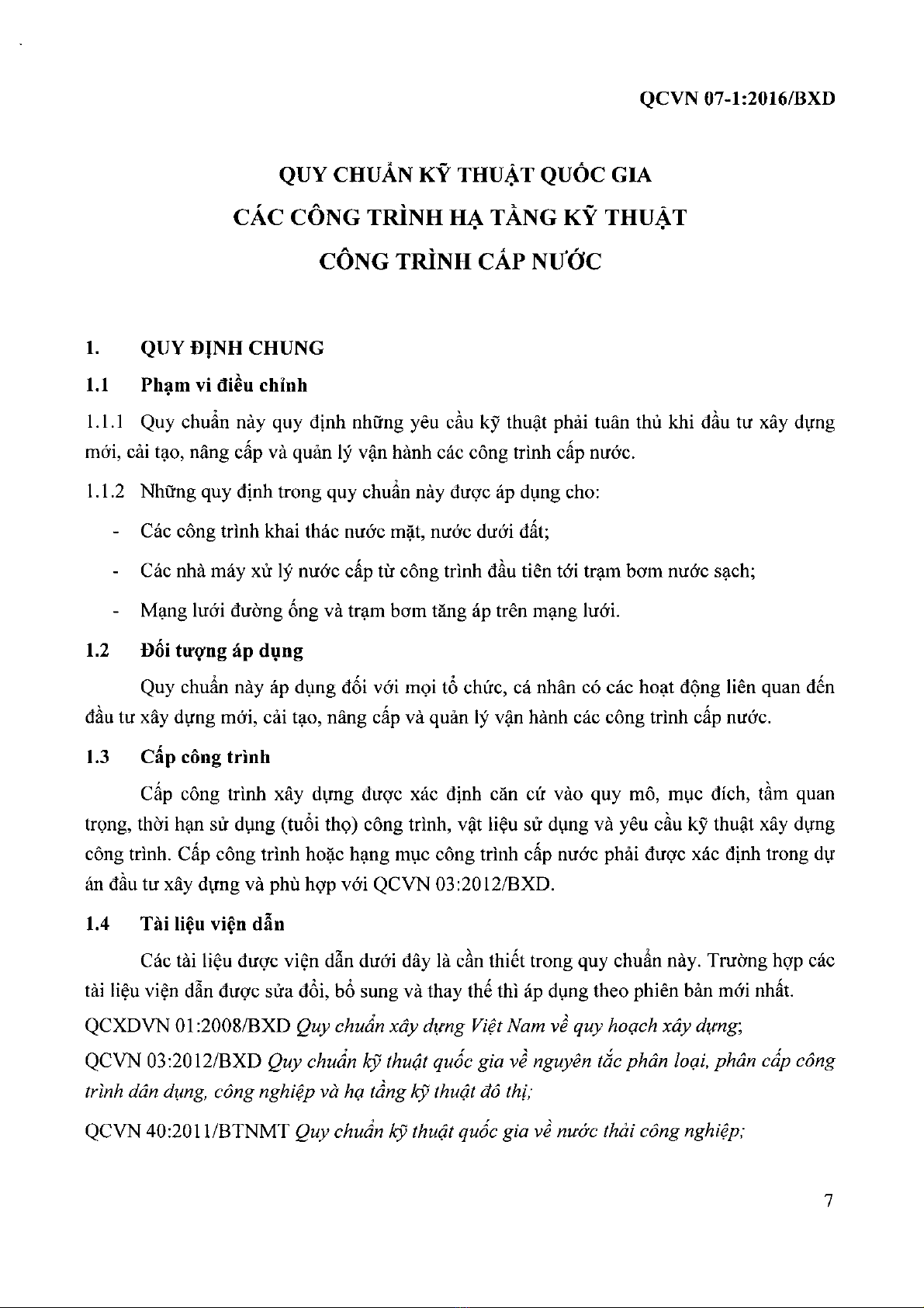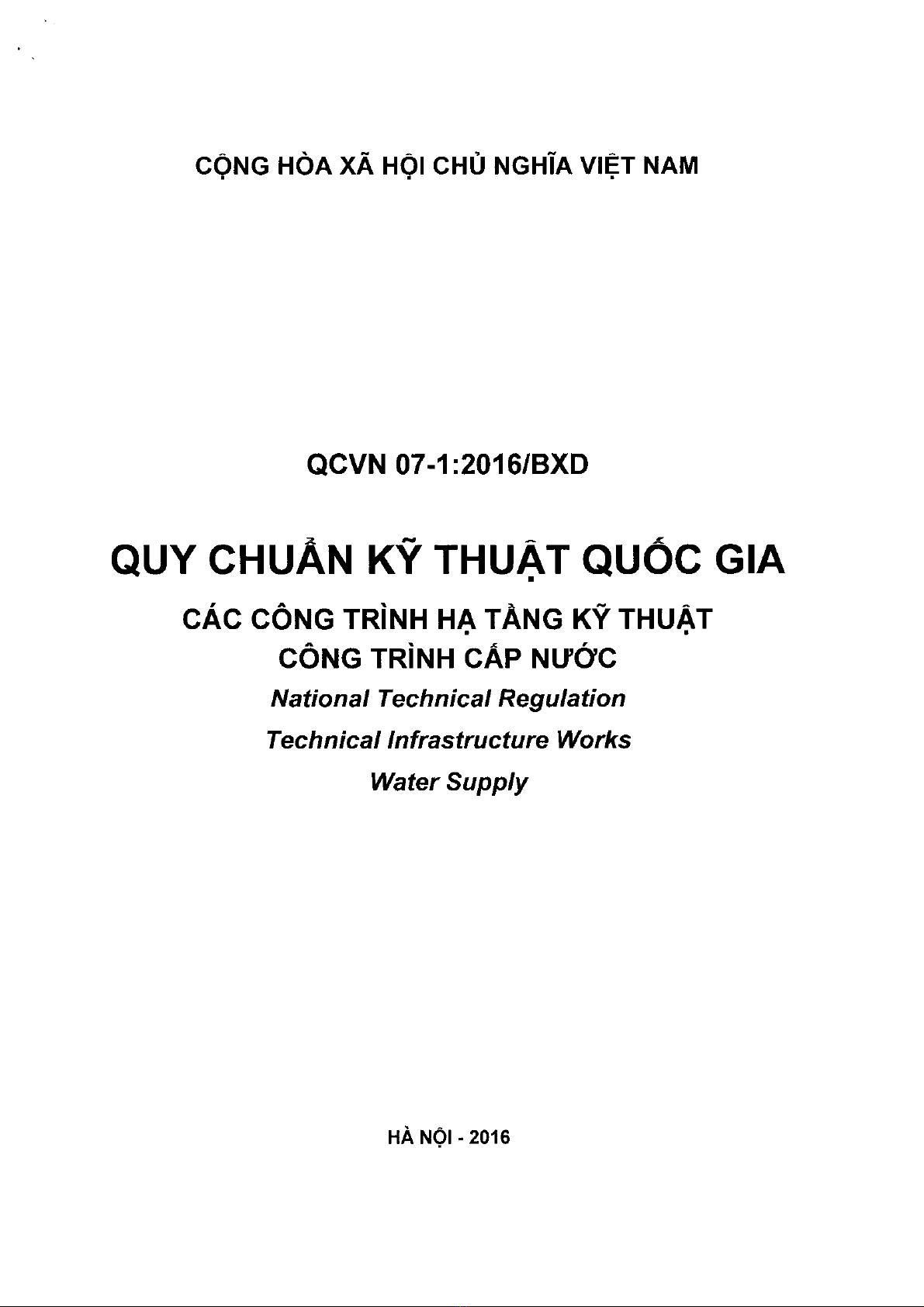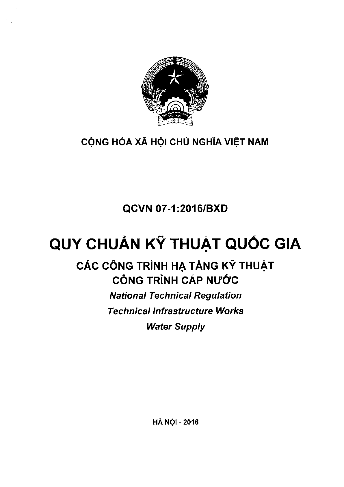 Quy chuẩn xây dựng Việt Nam QCVN 07-1:2016/BXD quy định những yêu cầu kỹ thuật phải tuân thủ khi đầu tư xây dựng mới, cải tạo, nâng cấp và quản lý vận hành các công trình cấp nước. Những quy định trong quy chuẩn này được áp dụng cho: các công trình khai thác nước mặt, nước dưới đất; các nhà máy xử lý nước cấp từ công trình đầu tiên tới trạm bơm nước sạch; mạng lưới đường ống và trạm bơm tăng áp trên mạng lưới.
