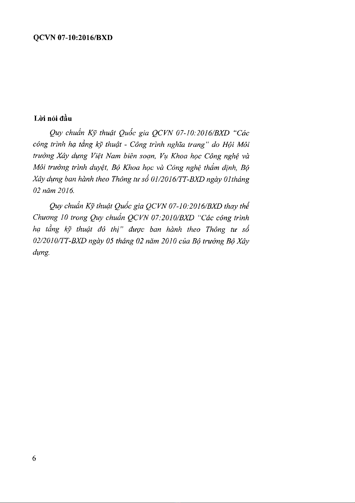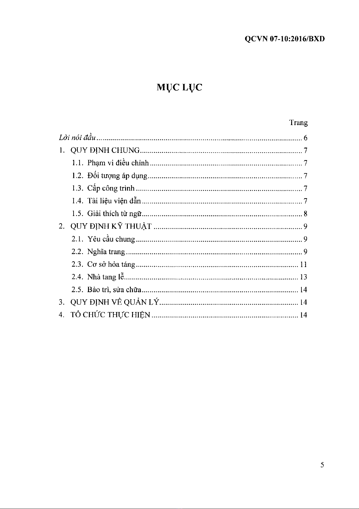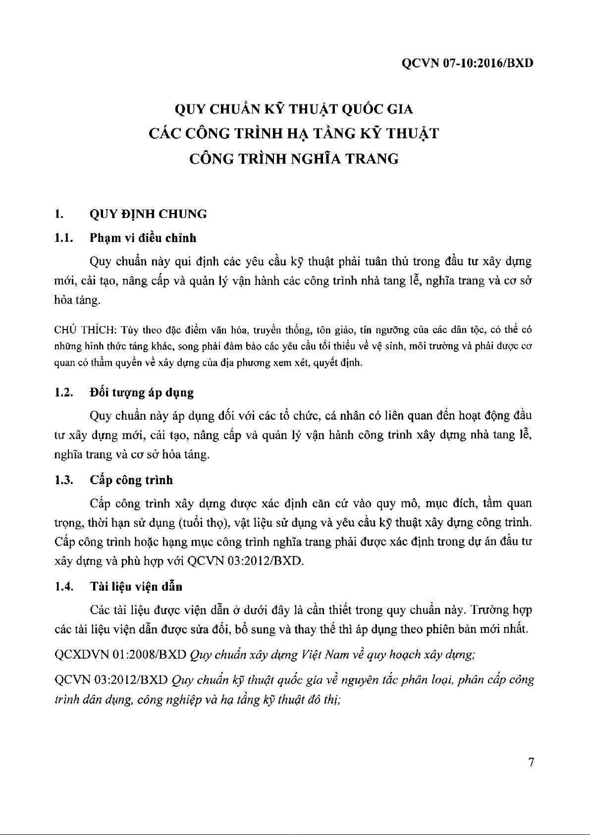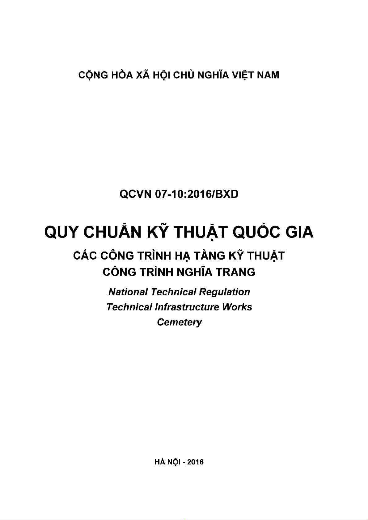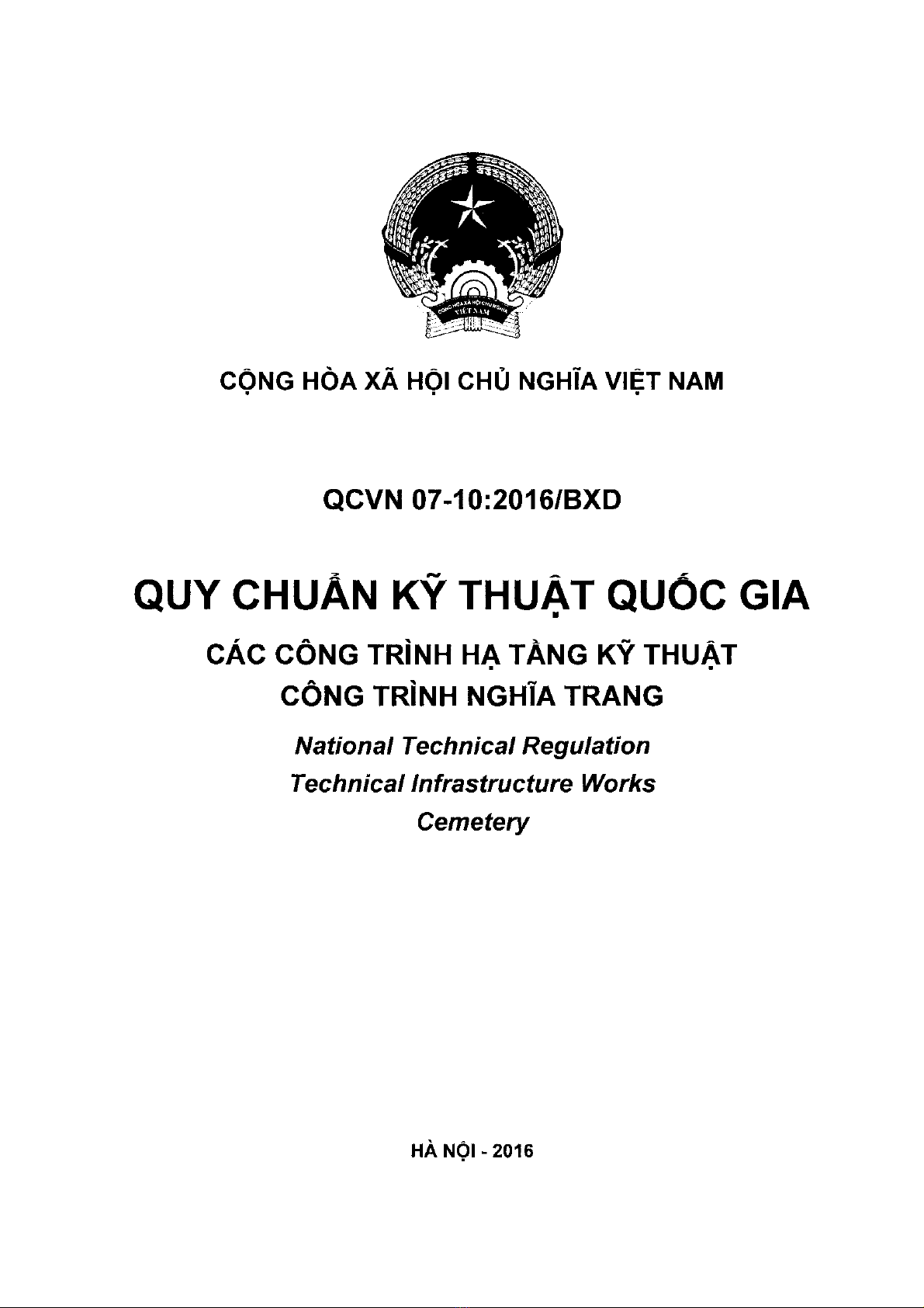 Quy chuẩn xây dựng Việt Nam QCVN 07-10:2016/BXD qui định các yêu cầu kỹ thuật phải tuân thủ trong đầu tư xây dựng mới, cải tạo, nâng cấp và quản lý vận hành các công trình nhà tang lễ, nghĩa trang và cơ sở hỏa táng. Quy chuẩn này áp dụng đối với các tổ chức, cá nhân có liên quan đến hoạt động đầu tư xây dựng mới, cải tạo, nâng cấp và quản lý vận hành công trình xây dựng nhà tang lễ, nghĩa trang và cơ sở hỏa táng.