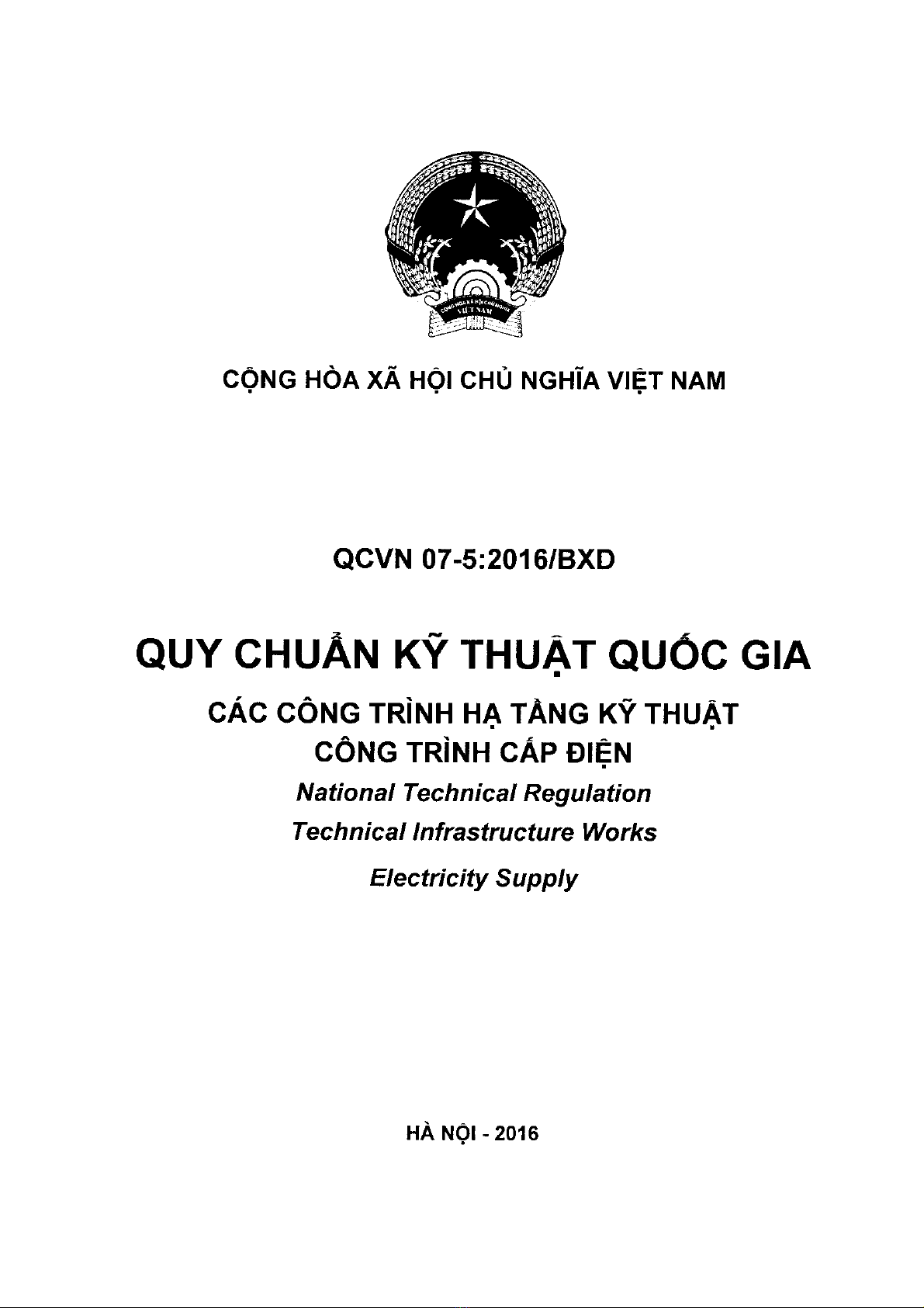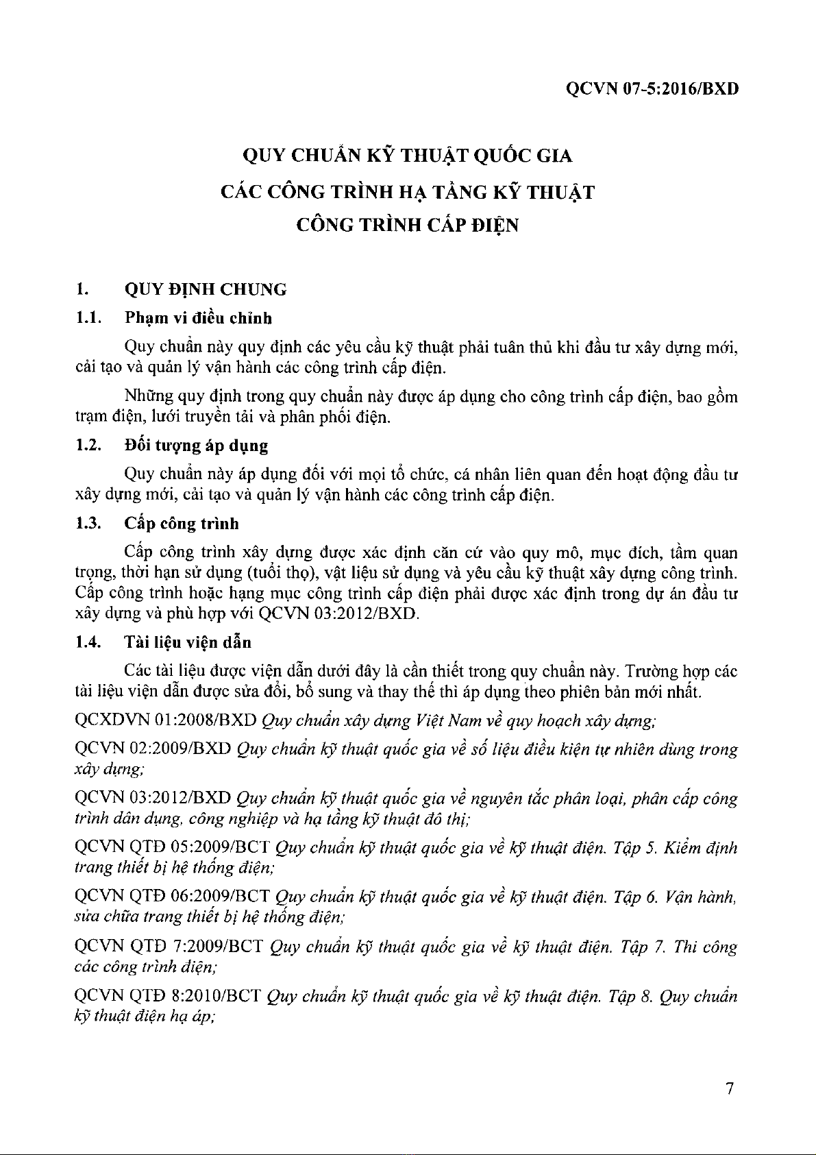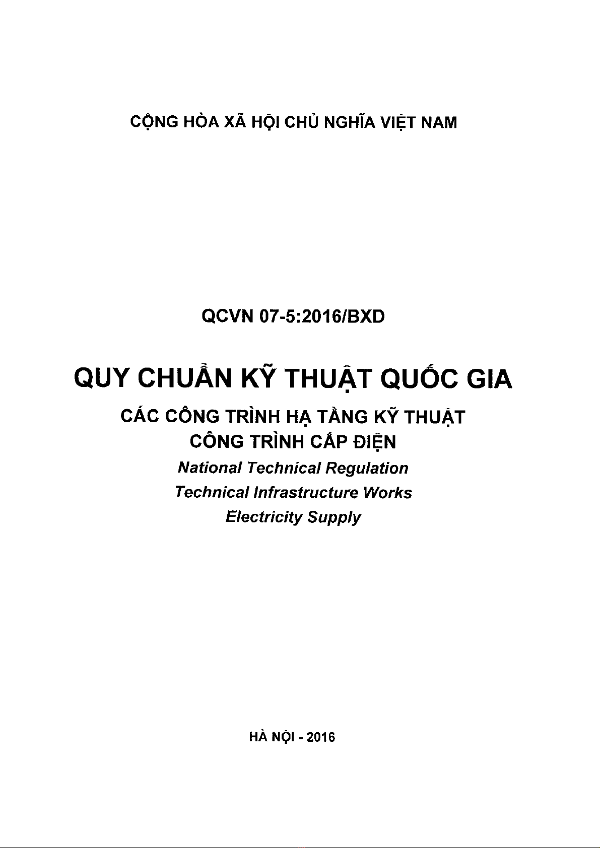 Quy chuẩn xây dựng Việt Nam QCVN 07-5:2016/BXD quy định các yêu cầu kỹ thuật phải tuân thủ khi đầu tư xây dựng mới, cải tạo và quản lý vận hành các công trình cấp điện. Những quy định trong quy chuẩn này được áp dụng cho công trình cấp điện, bao gồm trạm điện, lưới truyền tải và phân phối điện. Quy chuẩn này áp dụng đối với mọi tổ chức, cá nhân liên quan đến hoạt động đầu tư xây dựng mới, cải tạo và quản lý vận hành các công trình cấp điện.