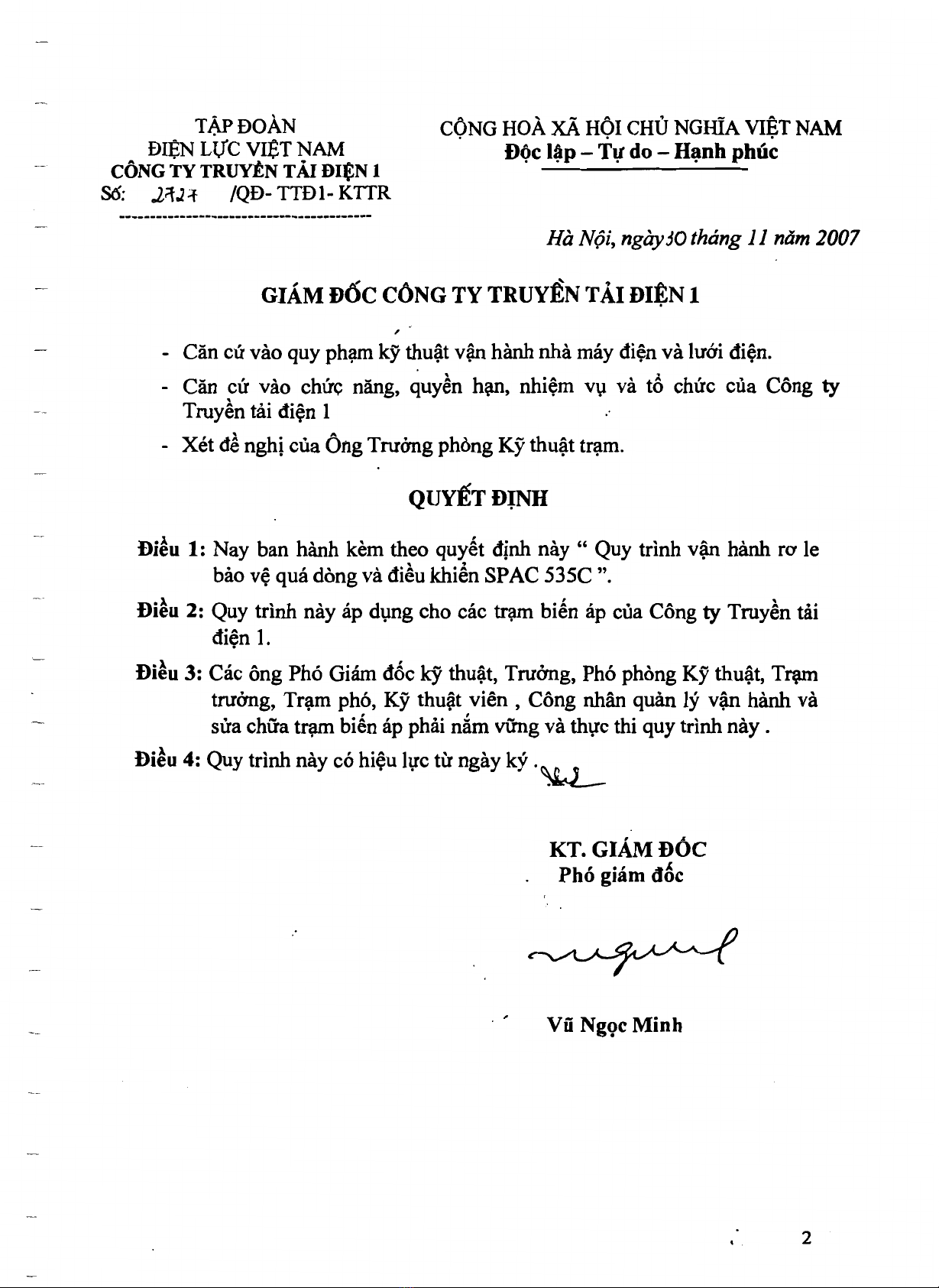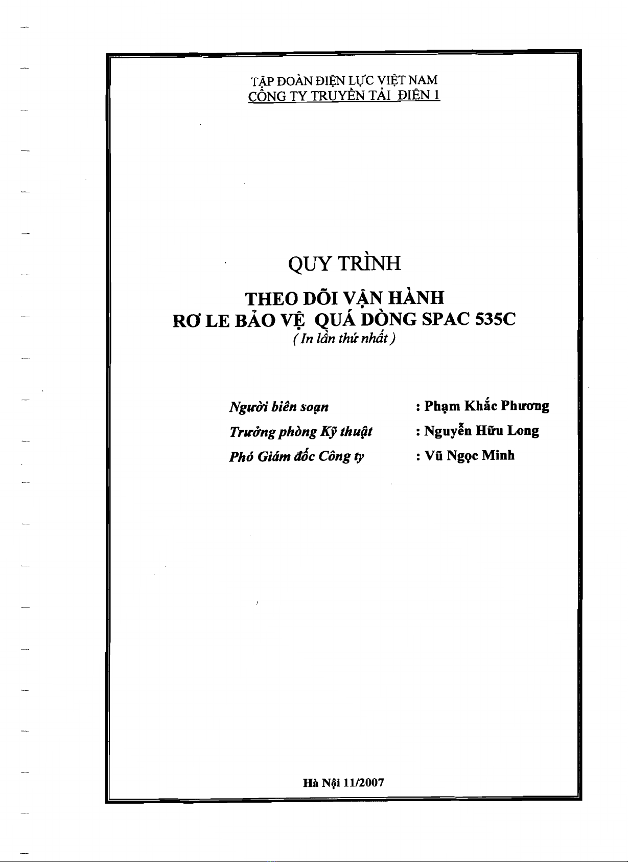 Quy trình theo dõi vận hành Rơ le bảo vệ quá dòng SPAC 535C được ban hành kèm quyết định 2727/QĐ-TTDD1-KTTR ngày 30 tháng 11 năm 2007. Nội dung quy định giới thiệu về Rơ le SPAC 535C, các chức năng của Rơ le SPAC 535C và vận hành Rơ le.