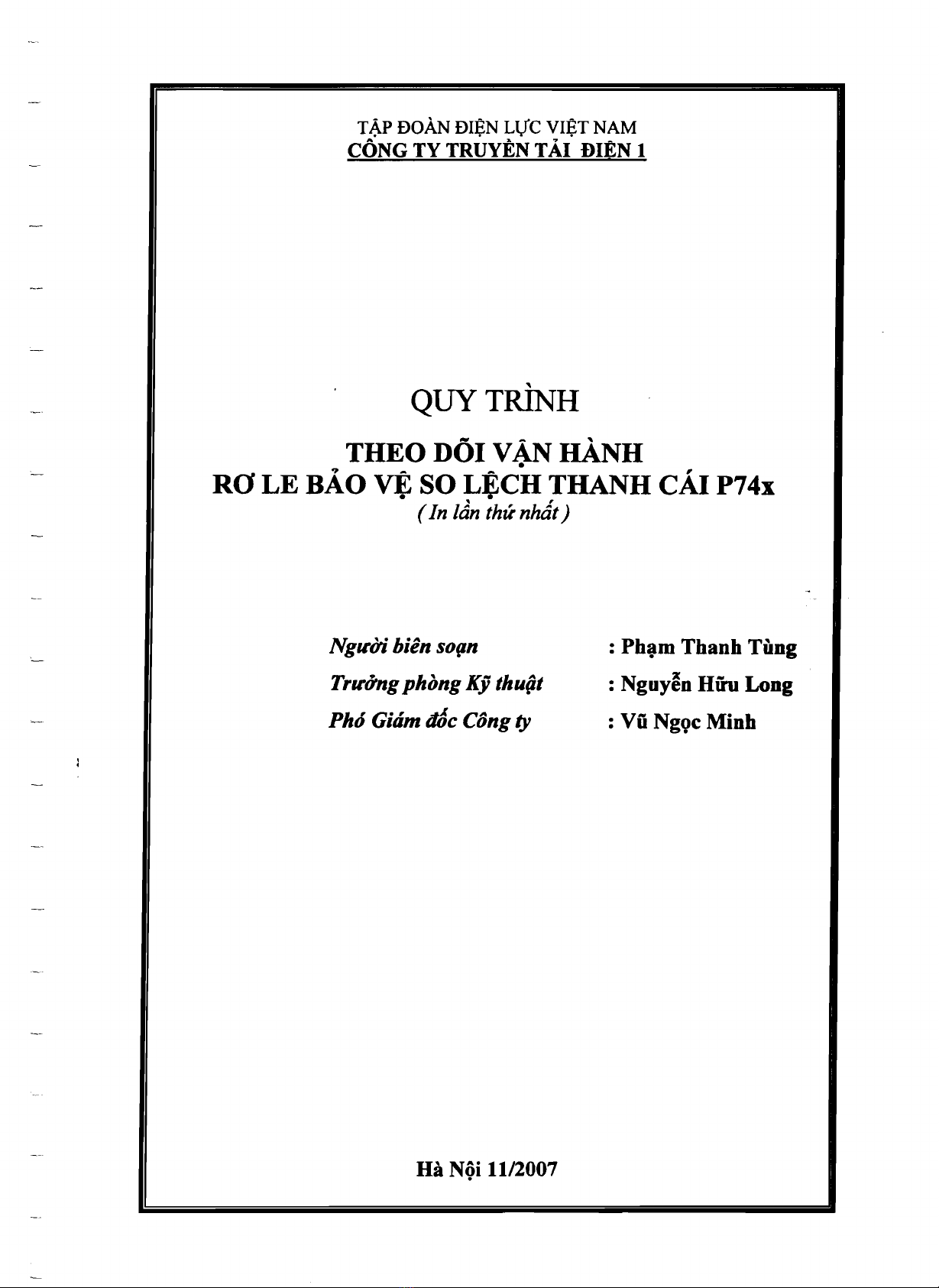 Quy trình Theo dõi vận hành Rơ le bảo vệ so lệch thanh cái P74x được ban hành kèm quyết định 2722/QĐ-TTDD1-KTTR ngày 30 tháng 11 năm 2007. Nội dung quy trình giới thiệu về Rơle bảo vệ so lệch thanh cái P74x và ứng dụng, các chức năng, vận hành Rơ le và những hư hỏng thường gặp trong vận hành.
