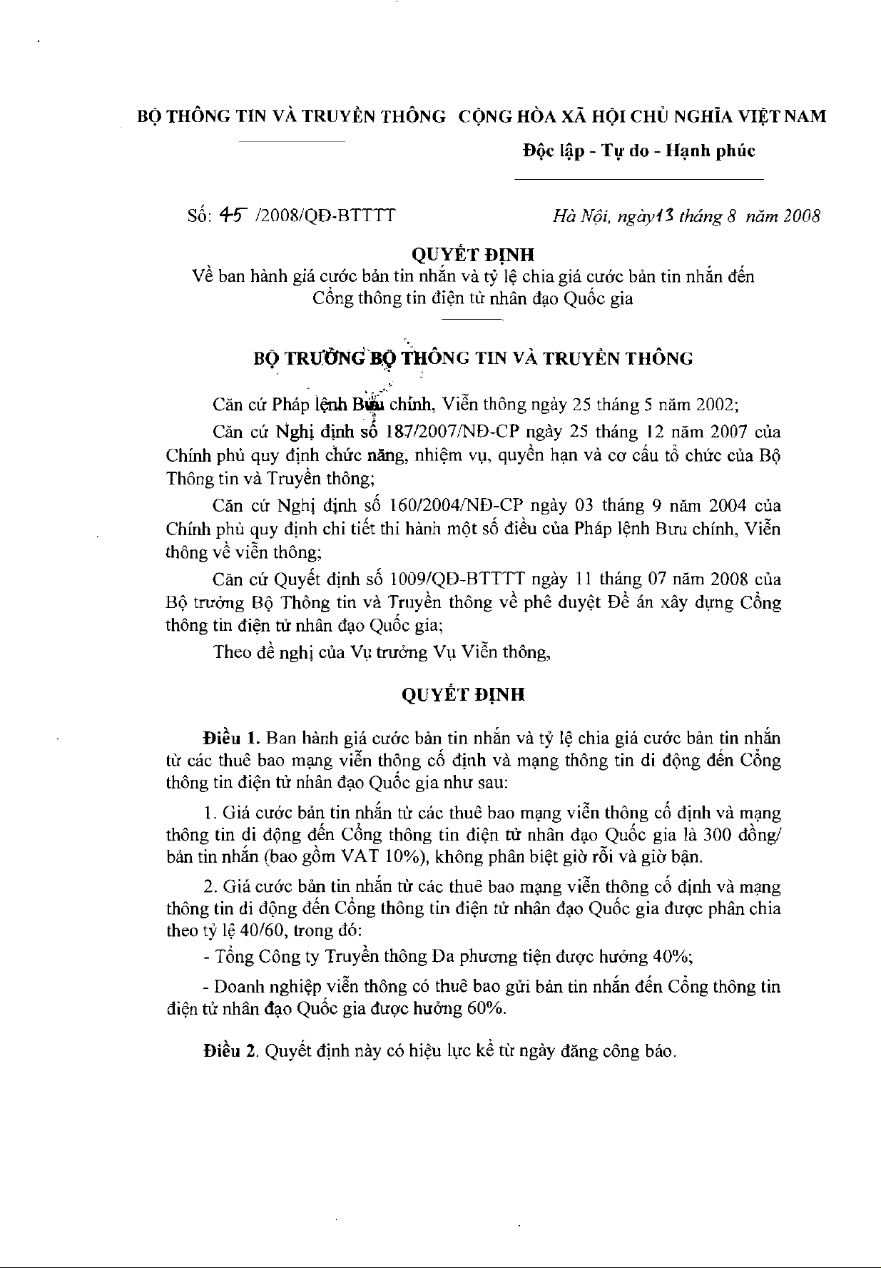 Quyết định 45/2008/QĐ-BTTTT của Bộ Thông tin và Truyền thông về ban hành giá cước bản tin nhắn và tỷ lệ chia giá cước bản tin nhắn đến Cổng thông tin điện tử nhân đạo Quốc gia