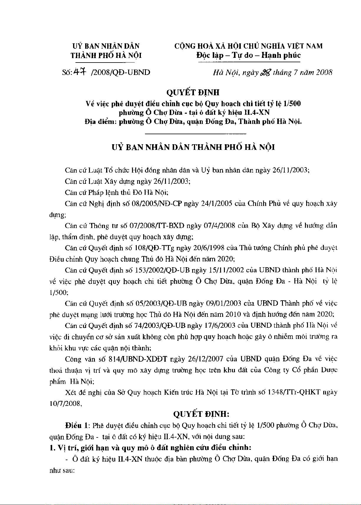 Quyết định số 47/2008/QĐ-UBND của Ủy ban Nhân dân Thành phố Hà Nội về việc phê duyệt điều chỉnh cục bộ Quy hoạch chi tiết tỷ lệ 1/500 phường Ô Chợ Dừa - tại ô đất ký hiệu II.4-XN. Địa điểm: phường Ô Chợ Dừa, quận Đống Đa, Thành phố Hà Nội.
