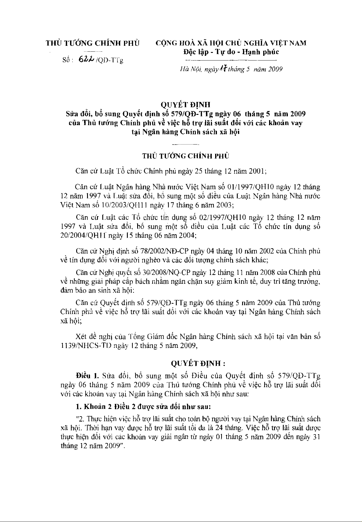 Quyết định 622/QĐ-TTg của Thủ tướng Chính phủ về sửa đổi, bổ sung Quyết định số 579/QĐ-TTg ngày 06 tháng 05 năm 2009 của Thủ tướng Chính phủ về việc hỗ trợ lãi suất đối với các khoản vay tại Ngân hàng Chính sách xã hội