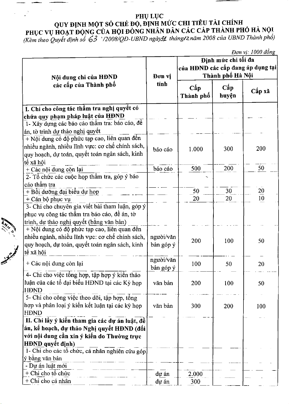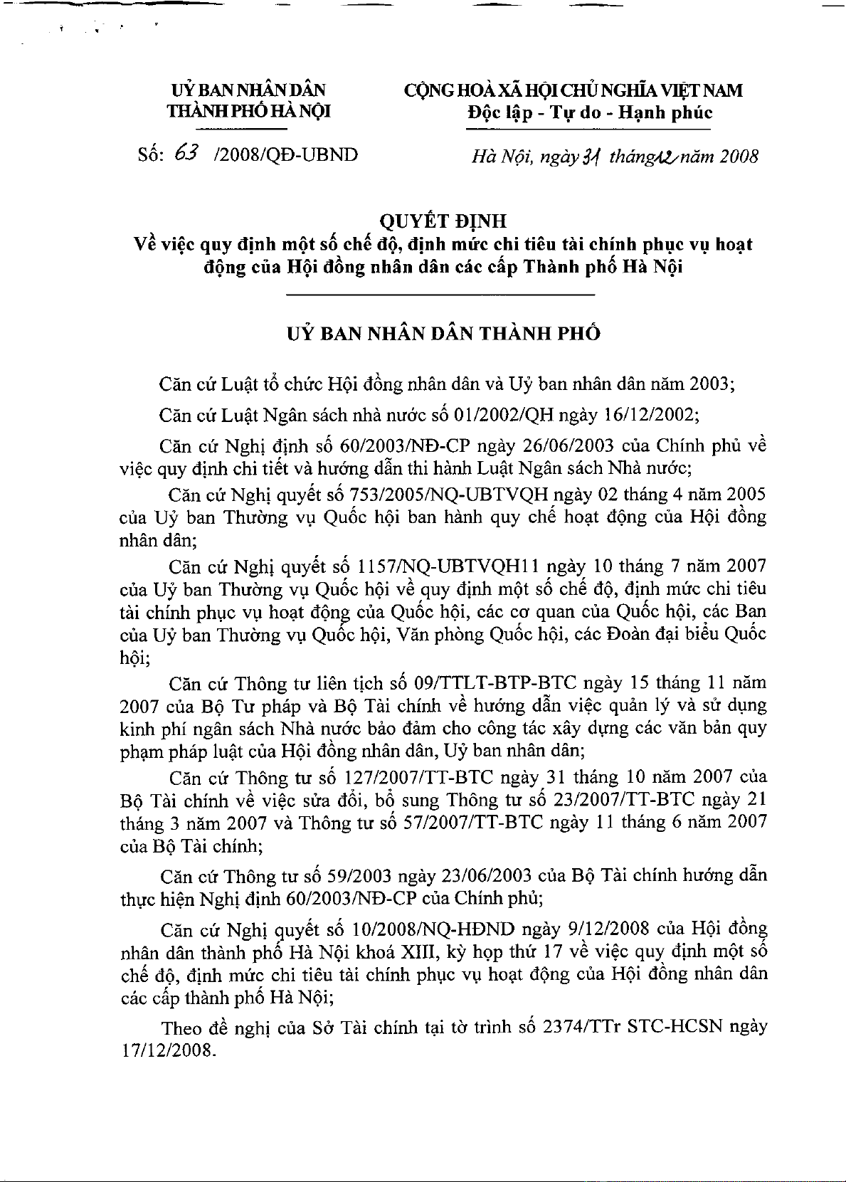 Quyết định 63/2008/QĐ-UBND của Uỷ ban Nhân dân Thành phố Hà Nội về việc quy định một số chế độ, định mức chi tiêu tài chính phục vụ hoạt động của Hội đồng nhân dân các cấp Thành phố Hà Nội