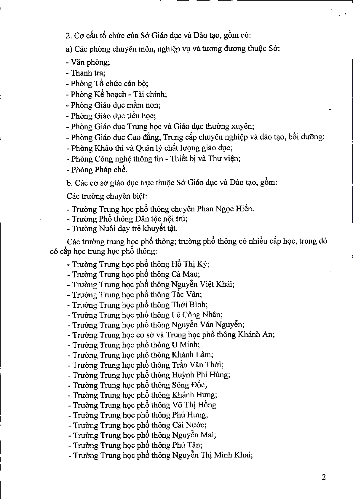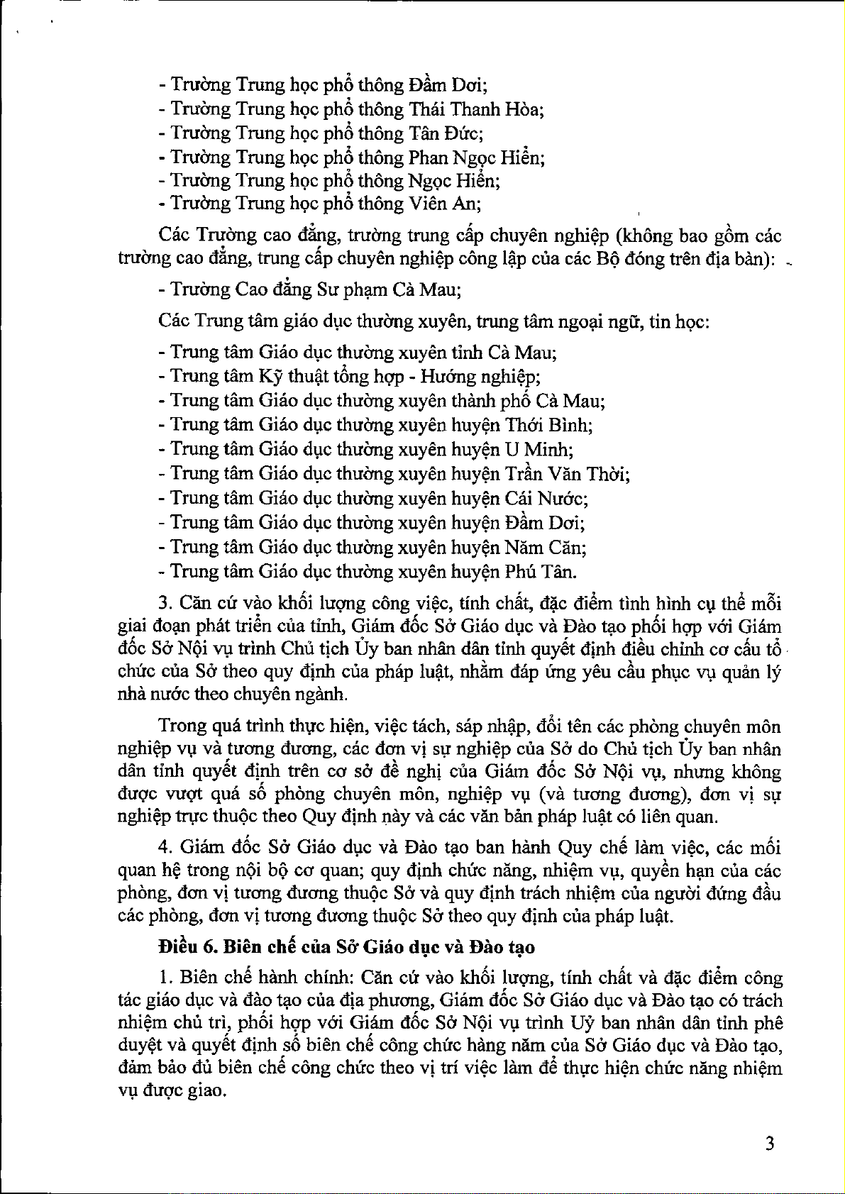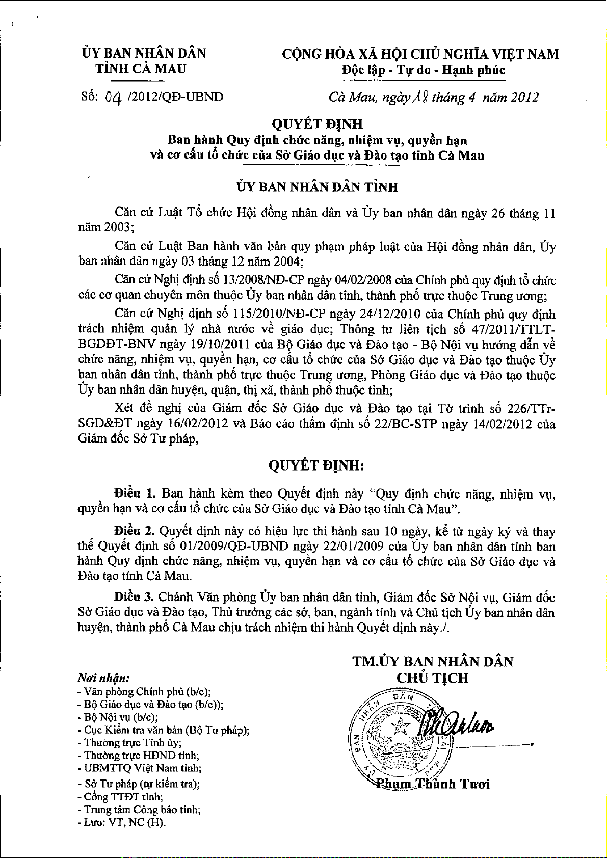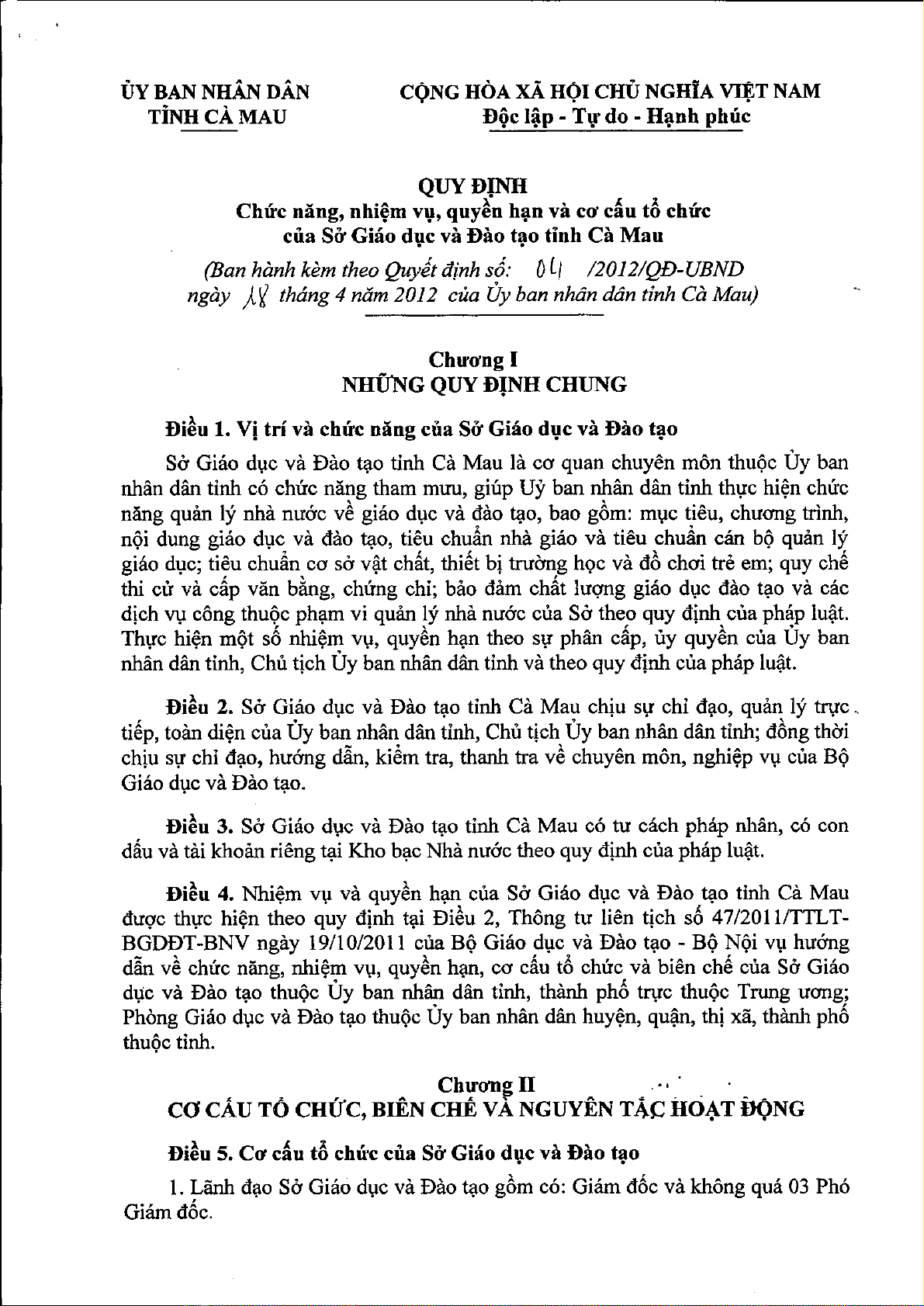 Quyết định ban hành quy định chức năng, nhiệm vụ, quyền hạn và cơ cấu tổ chức của sở giáo dục và đào tạo tỉnh Cà Mau ( số 4/2012/QĐ-UBND)