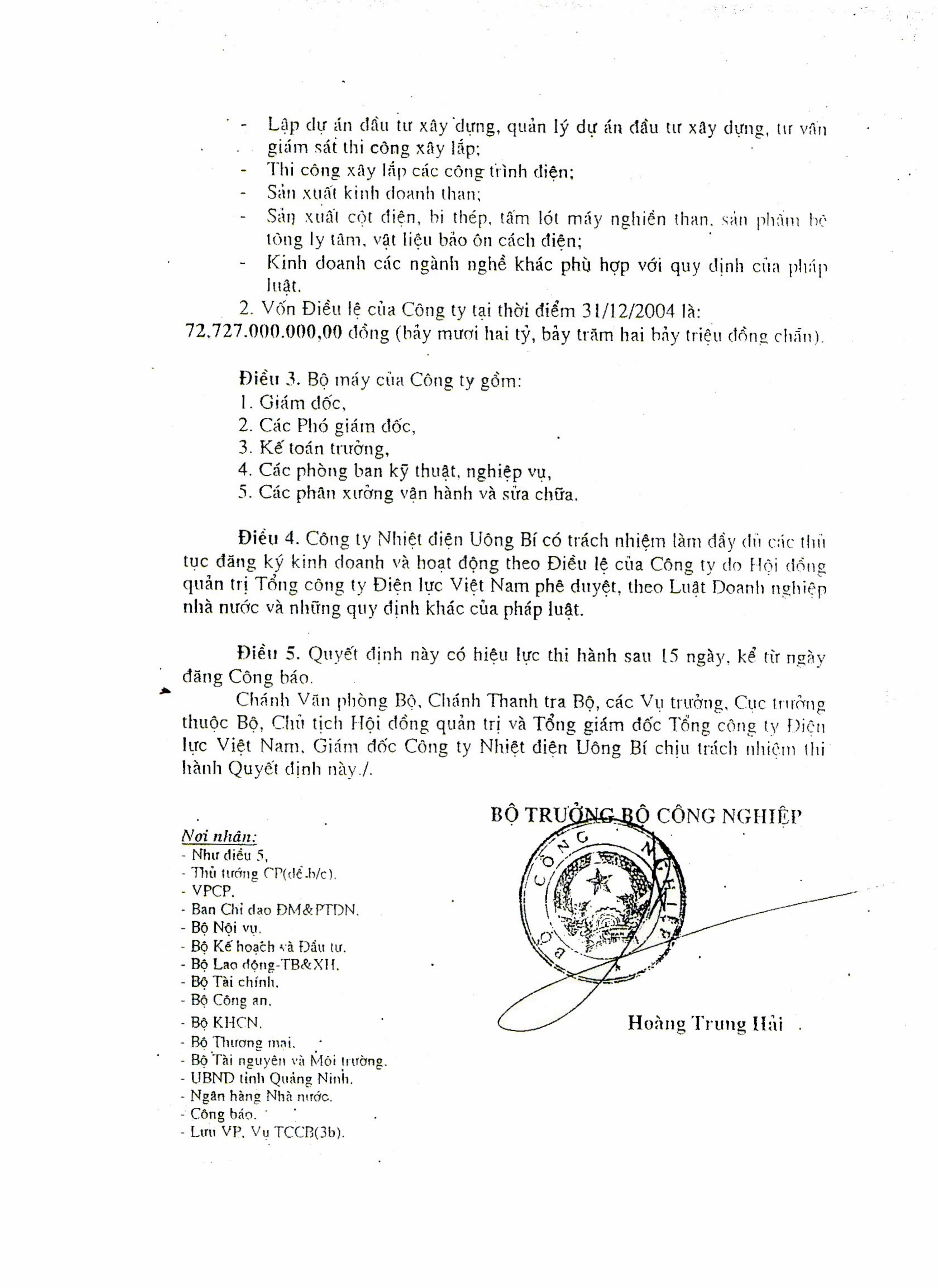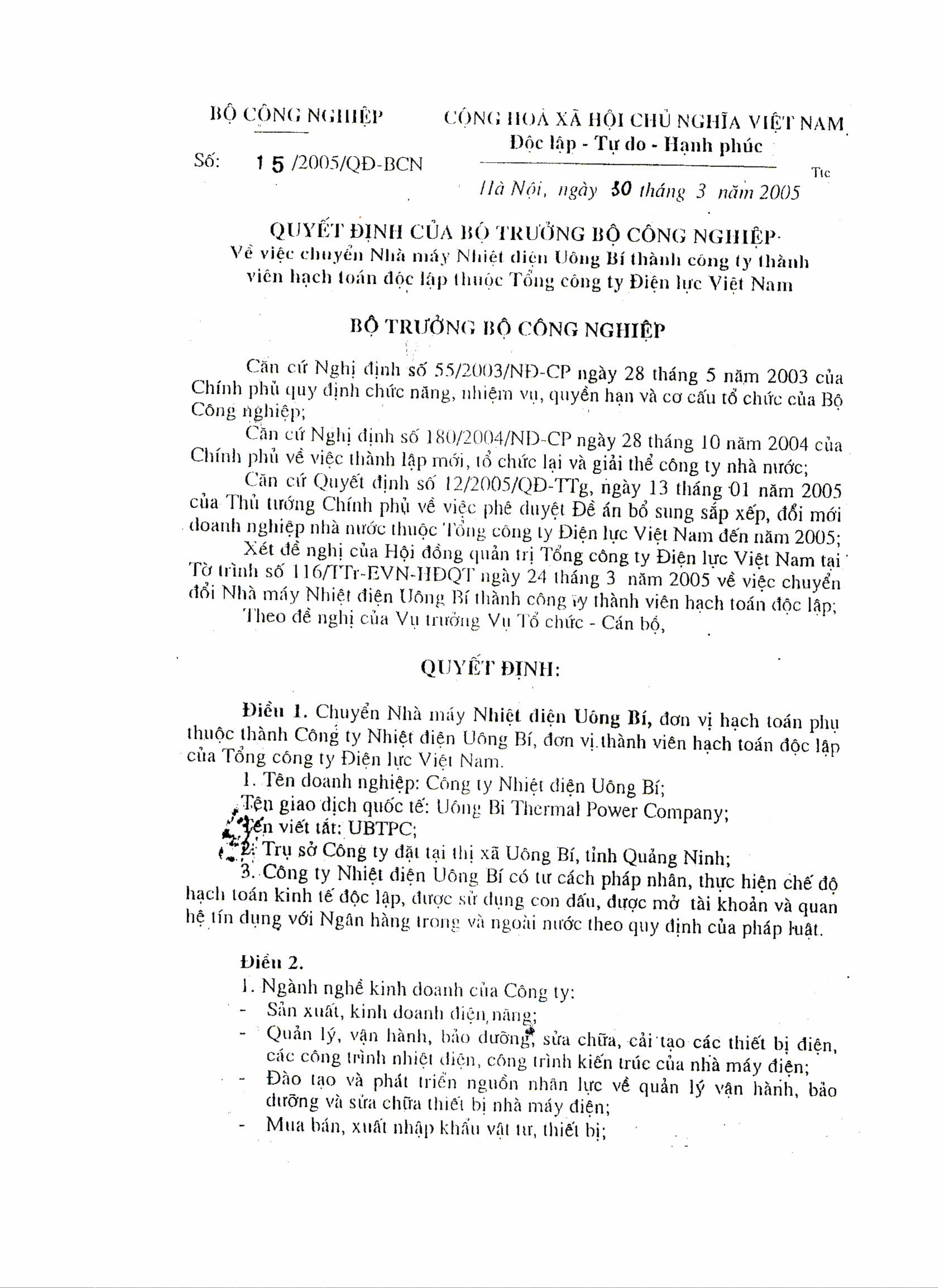 Quyết định số 15/2005/QĐ-BCN của Bộ Công nghiệp về việc chuyển nhà máy Nhiệt điện Uông Bí thành công ty thành viên hạch toán độc lập thuộc Tổng Công ty Điện lực Việt Nam