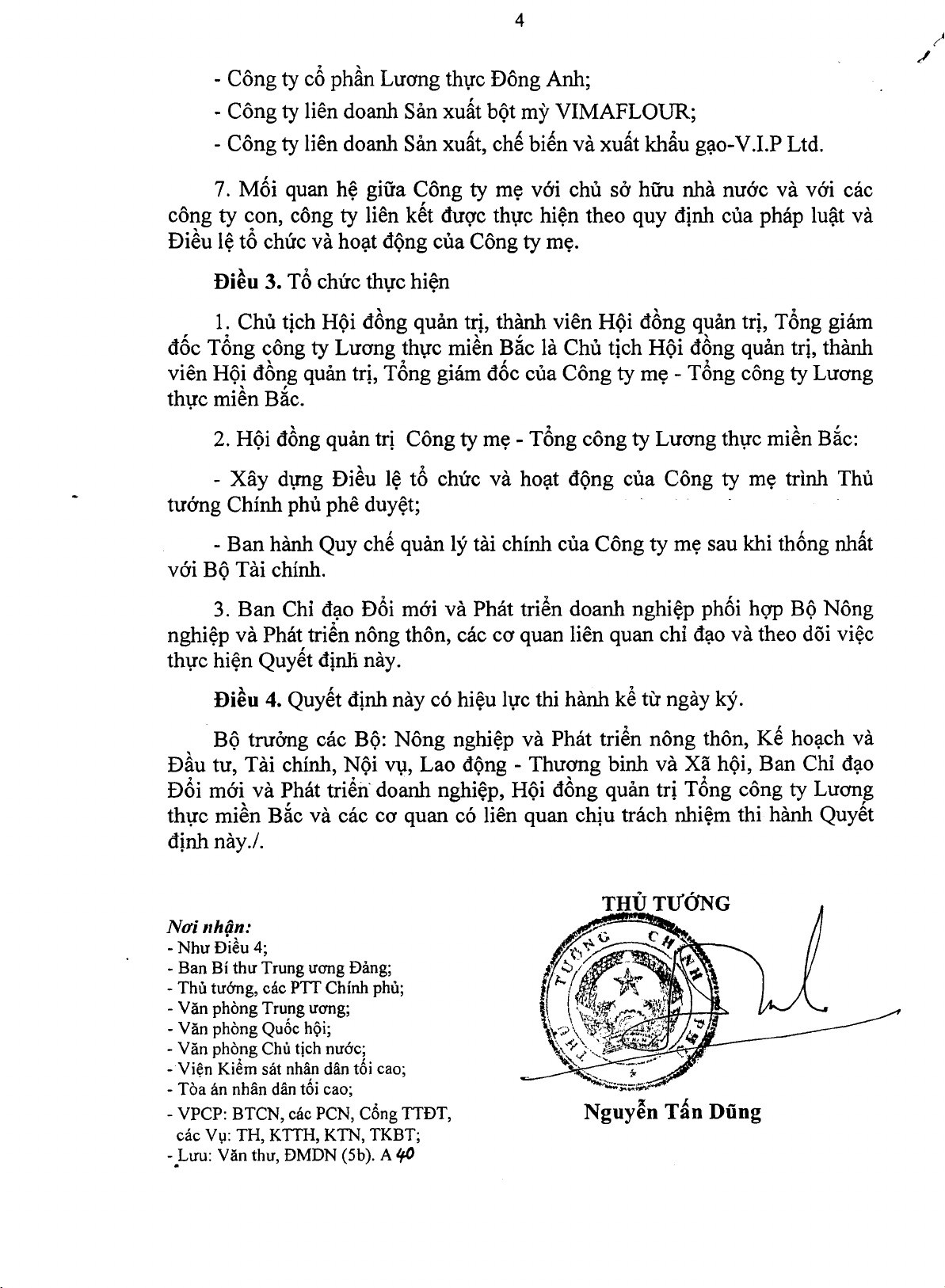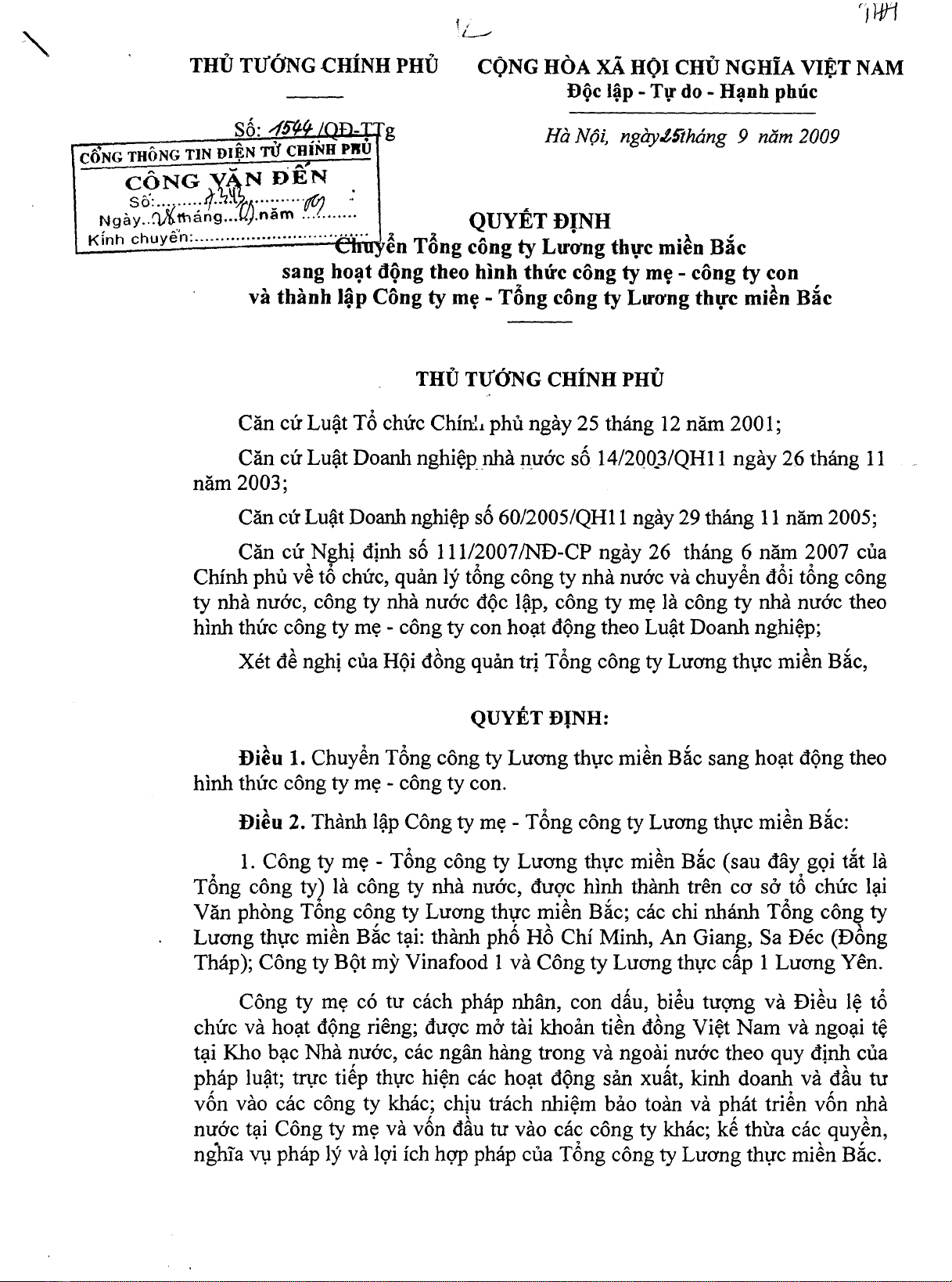 Quyết định chuyển Tổng công ty Lương thực miền Bắc sang hoạt động theo hình thức công ty mẹ - công ty con và thành lập Công ty mẹ - Tổng công ty lương thực miền Bắc.