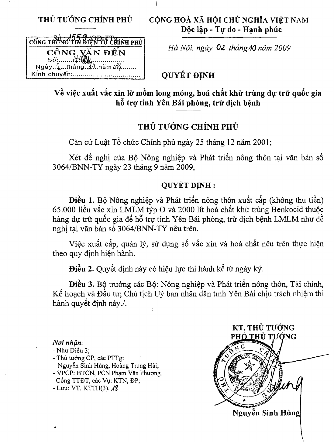 Quyết định về việc xuất vắc xin lở mồm long móng, hóa chất khử trùng dự trữ quốc gia hỗ trợ tỉnh Yên Bái phòng, trừ dịch bệnh.