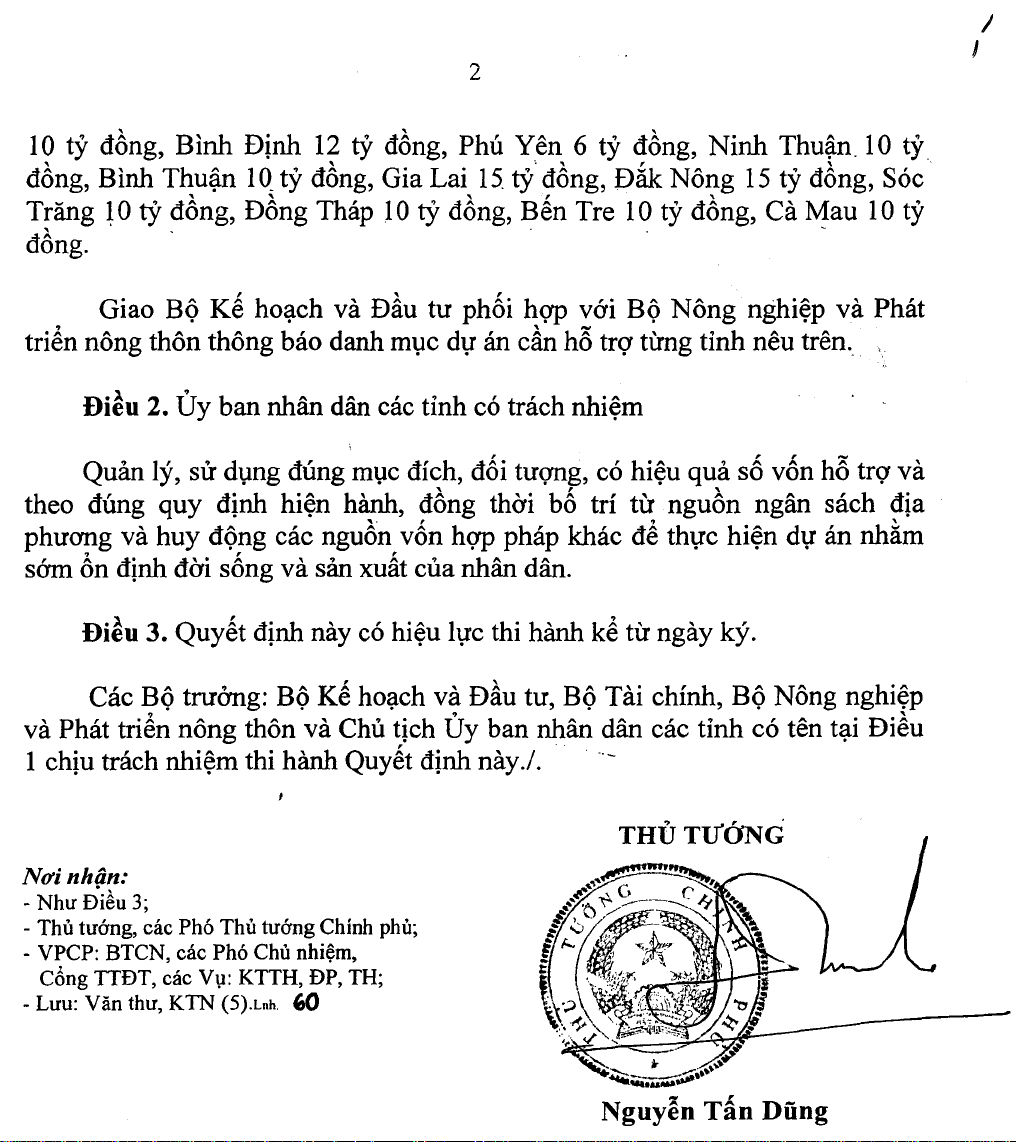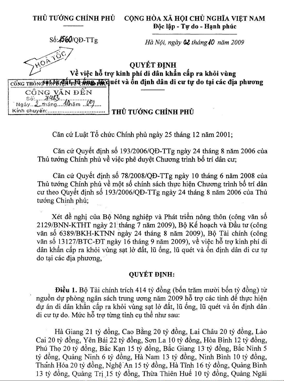 Quyết định về việc hỗ trợ kinh phí di dân khẩn cấp ra khỏi vùng sạt lở đất, lũ ống, lũ quét và ổn định dân di cư tự do tại các địa phương.