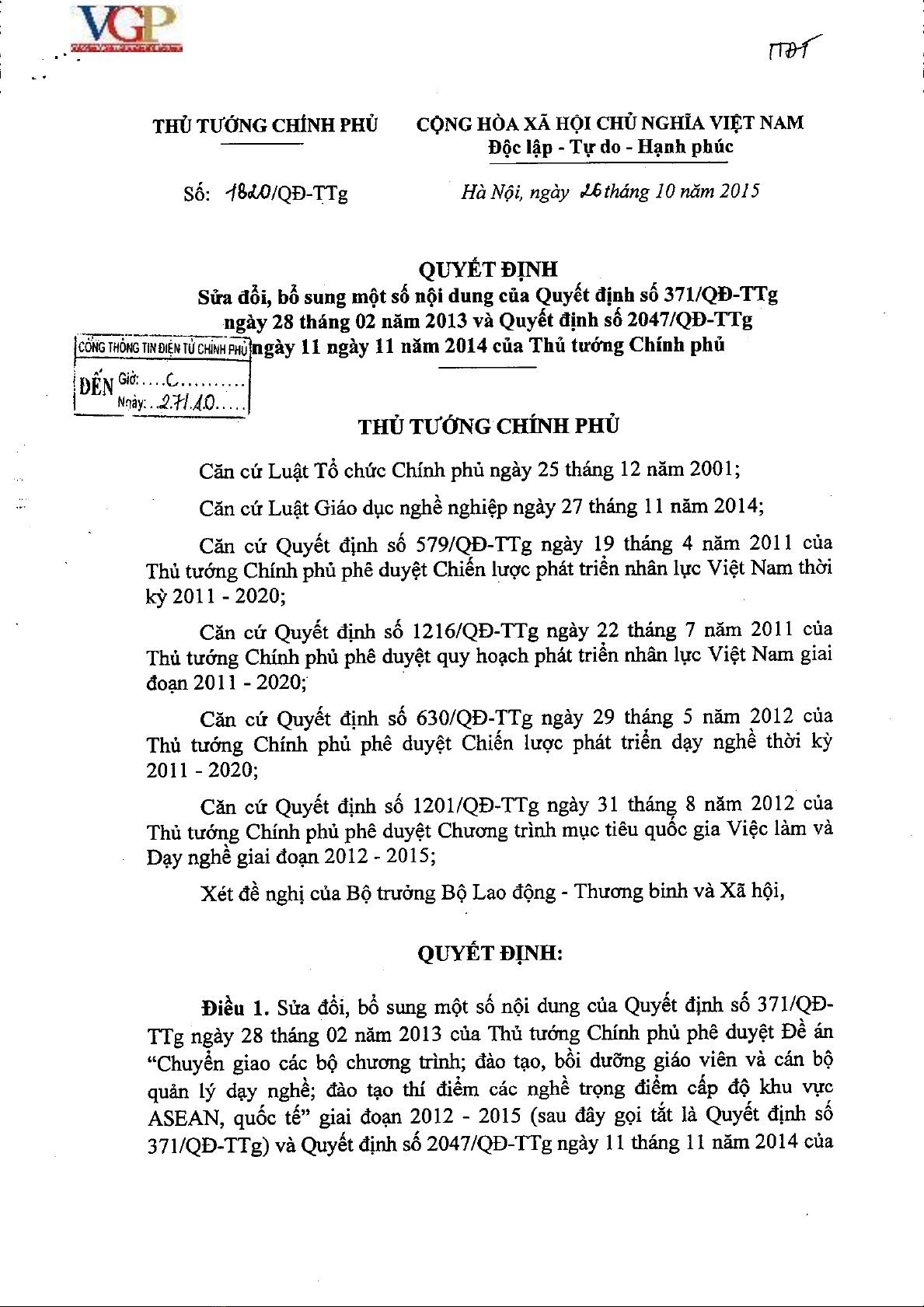 Quyết định số: 1820/QĐ-TTg "Sửa đổi, bổ sung một số nội dung của Quyết định số 371/QĐ-TTg ngày 28 tháng 02 năm 2013 và Quyết định số 2047/QĐ-TTg ngày 11 ngày 11 năm 2014 của Thủ tướng Chính phủ" xét theo đề nghị của Bộ Lao động Thương binh và Xã hội. Mời các bạn cùng tham khảo nội dung chi tiết.