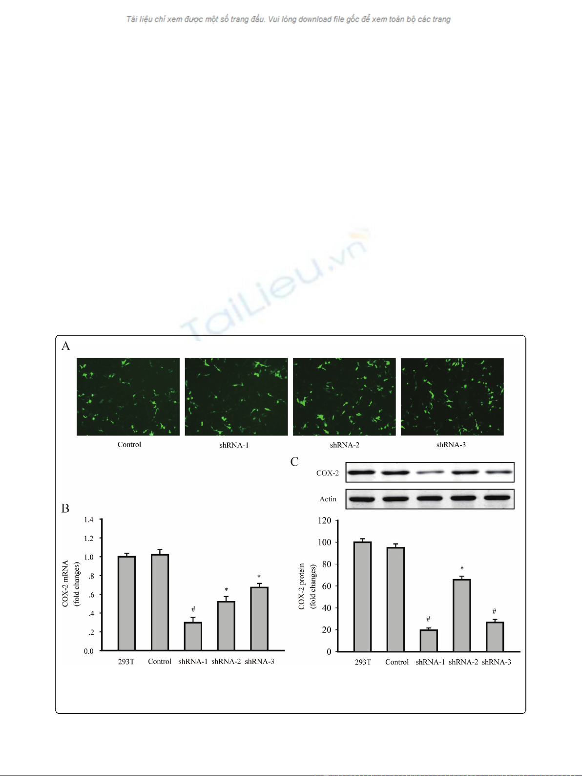 Figure 1 Downregulation of COX-2 expression in 293T cells by shRNA transfection. (A) GFP expressed 48 h after the transfection of the