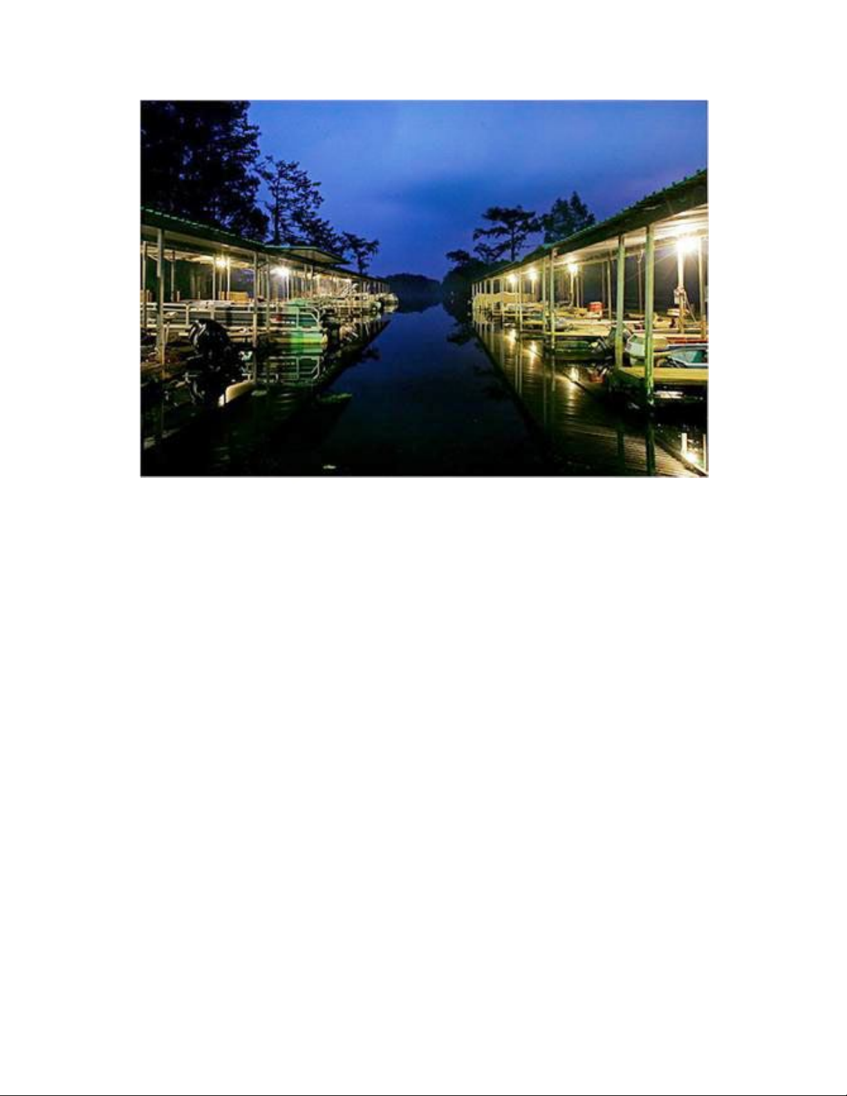 Bến đỗ cho các du thuyền trên hồ chìm đắm trong màu xanh ngắt khi trời chạng vạng.