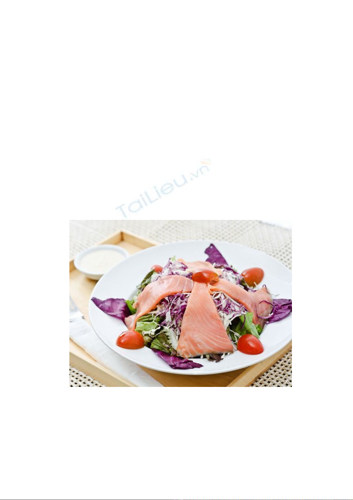 Cắt cá hồi cắt thành 4 lát. Cắt cải xà lách thành miếng xếp vào giữa dĩa, cho bắp cải bào