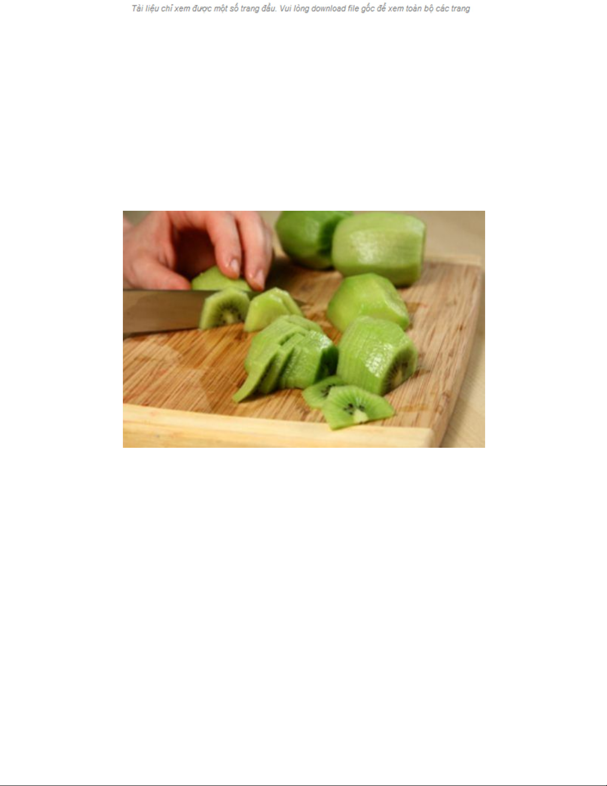 Kiwi gọt vỏ, cắt làm đôi theo chiều dọc rồi thái miếng dày khoảng 3mm.