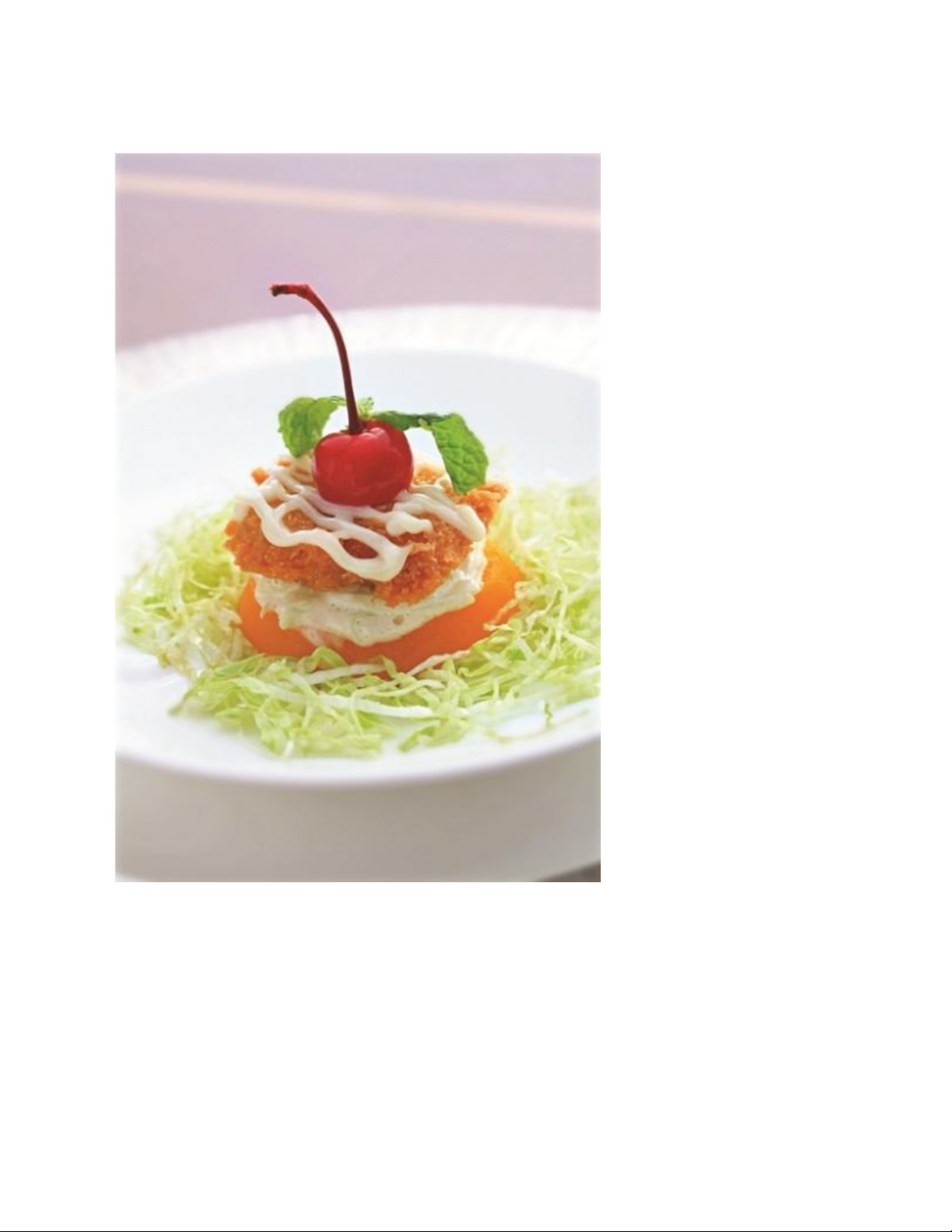 mayonnaise, trang trí trái sơ ri lên trên cùng với rau thơm. Trang trí salad dưa leo xung quanh.