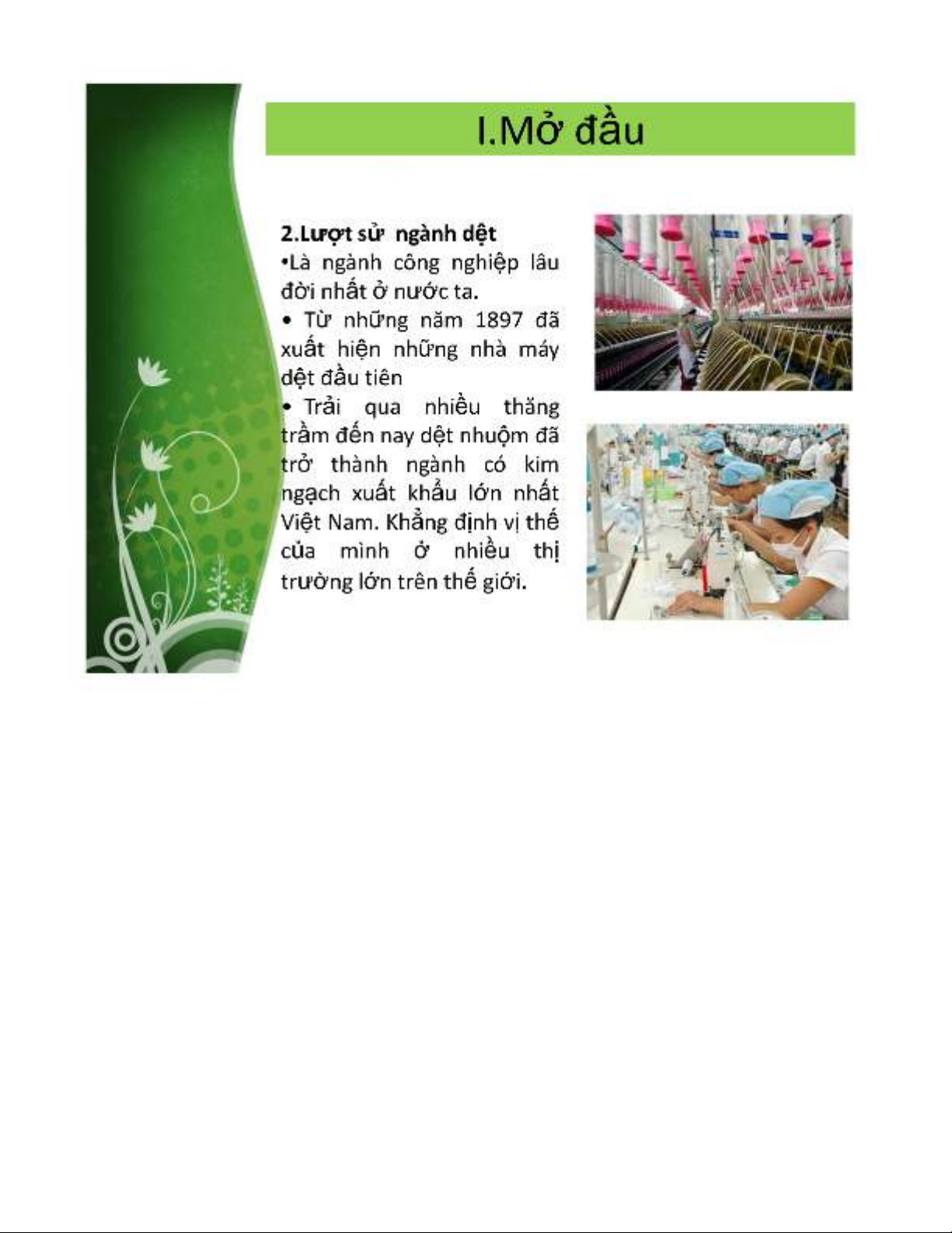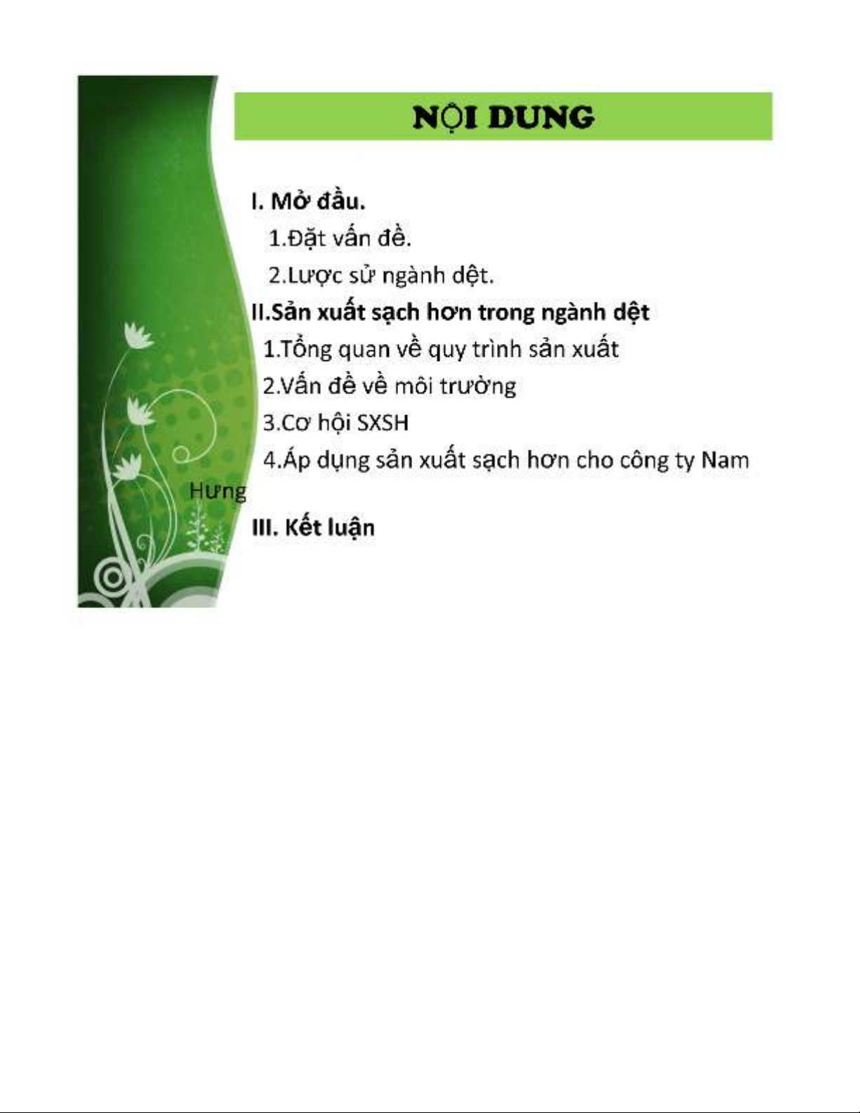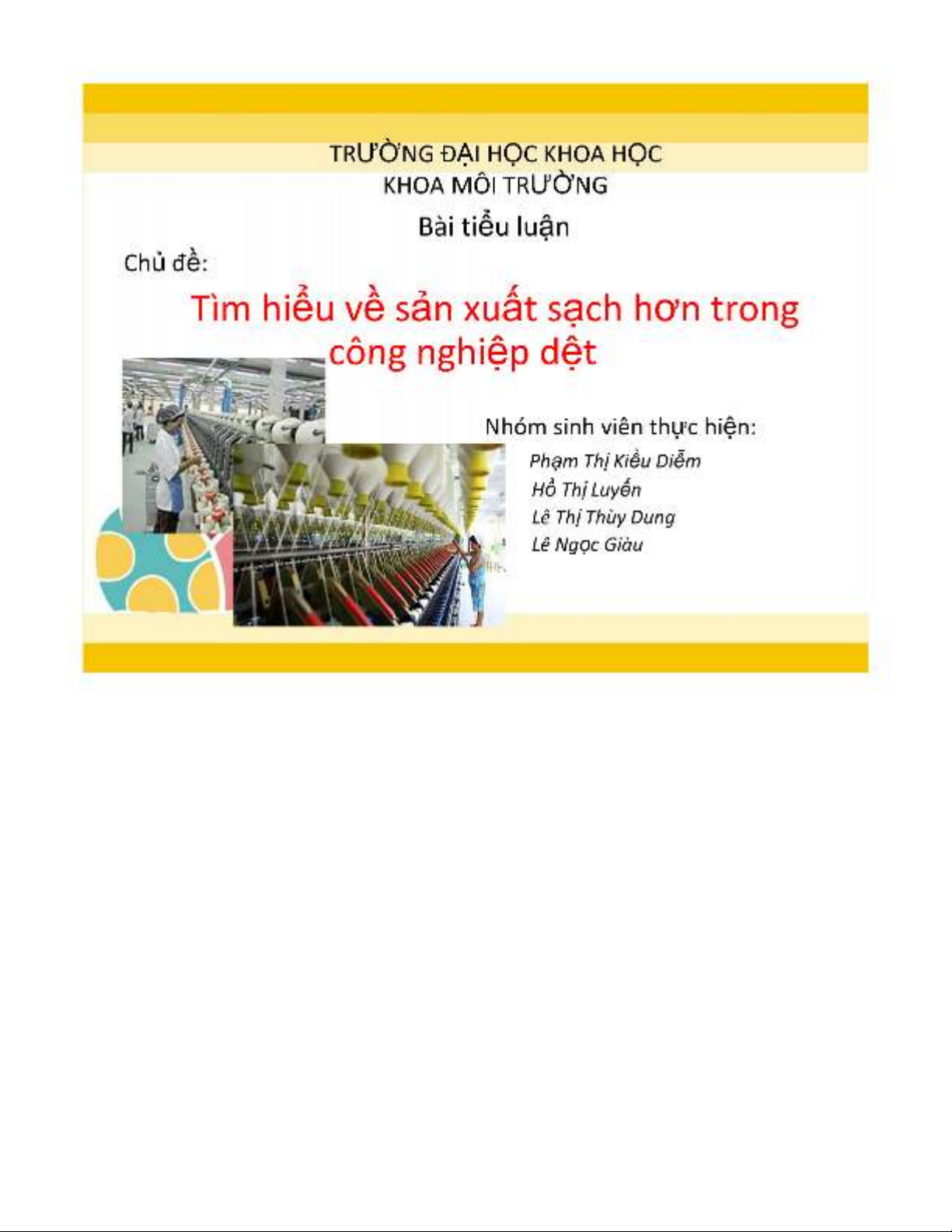 Đề tài: Tìm hiểu về sản xuất sạch hơn trong công nghiệp dệt do nhóm sinh viên khoa Môi trường trường ĐH Khoa học phối hợp thực hiện. Bài tiểu luận trình bày lược sử về ngành dêt, tổng quan về quy trình sản xuất sách hơn trong ngành dêt, vấn đề môi trường, cơ hội sản xuất sạch và áp dụng sản xuất sạch hơn cho công ty Nam Hưng. Mời bạn đọc cùng tham khảo.
