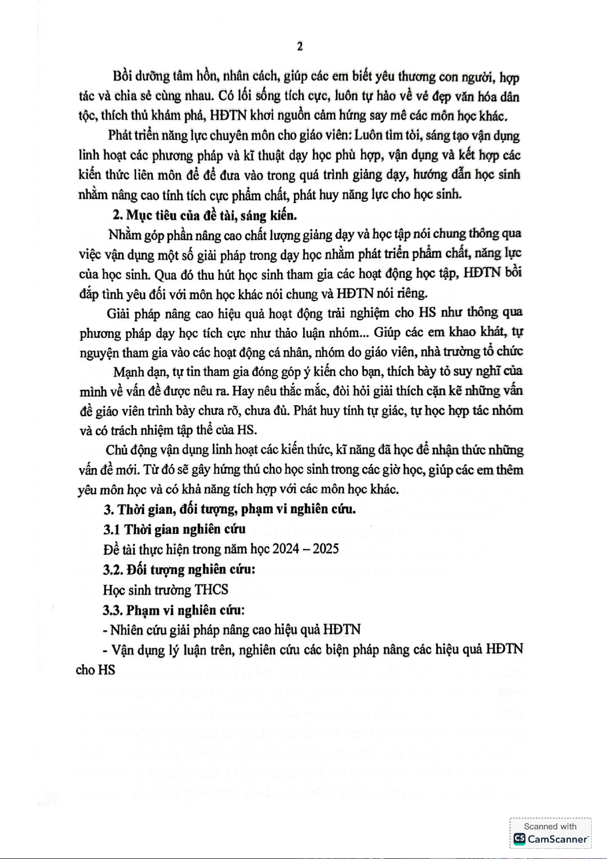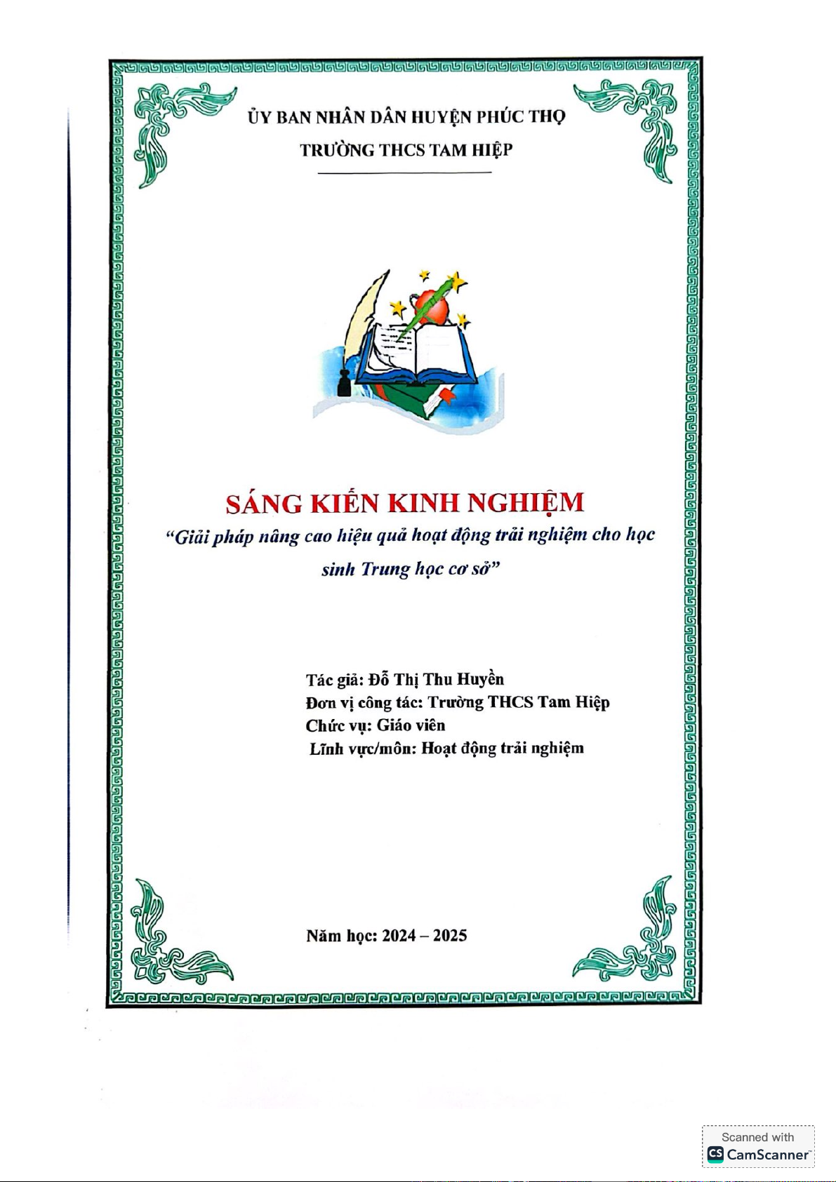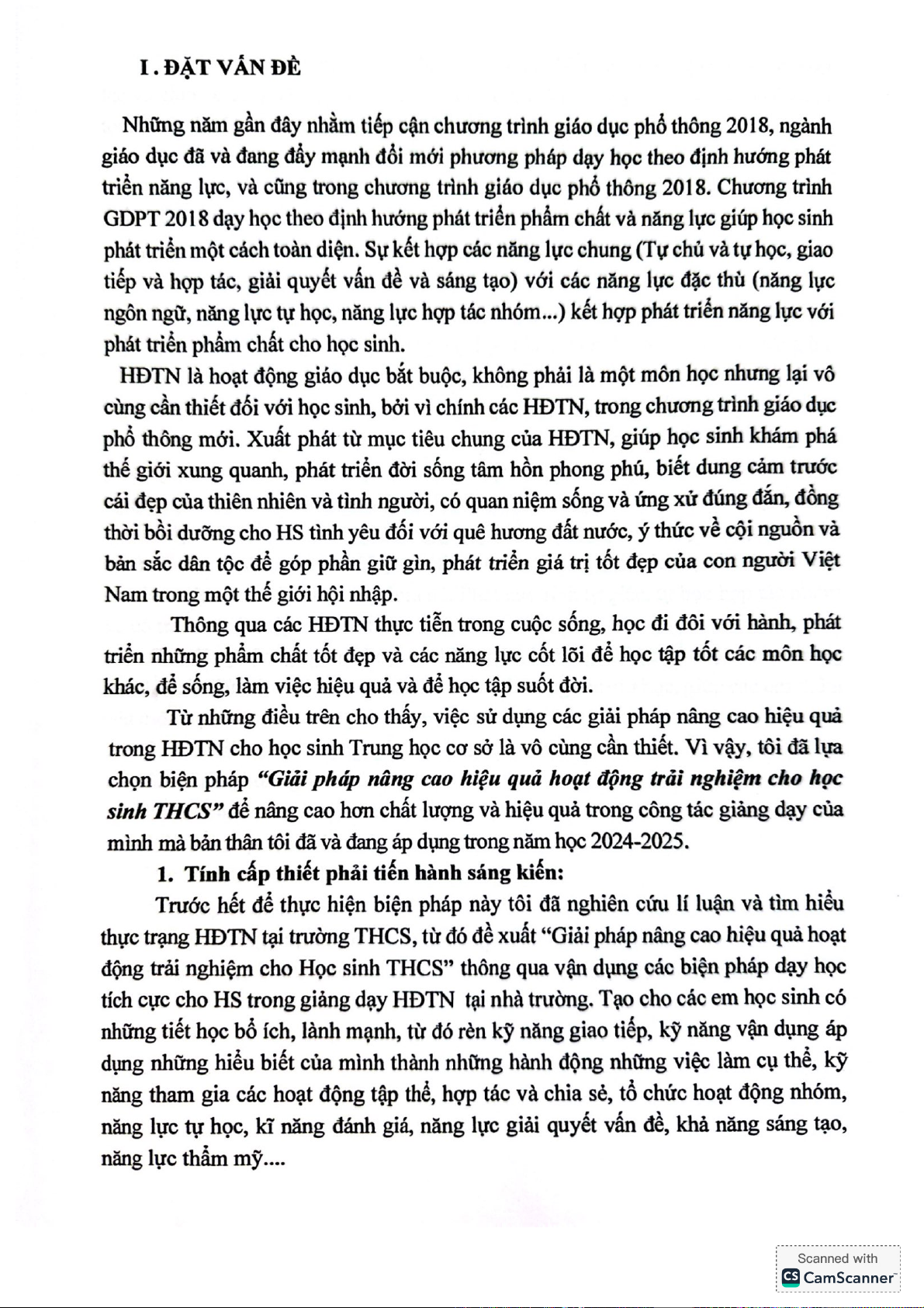Trong bối cảnh đổi mới giáo dục theo chương trình giáo dục phổ thông 2018, việc phát triển phẩm chất và năng lực toàn diện cho học sinh trở thành ưu tiên hàng đầu. Hoạt động trải nghiệm (HĐTN) được xác định là một cấu phần bắt buộc và thiết yếu, không chỉ giúp học sinh khám phá thế giới, phát triển tâm hồn, mà còn rèn luyện các năng lực cốt lõi cần thiết cho cuộc sống và học tập. Tuy nhiên, hiệu quả của HĐTN tại cấp Trung học cơ sở vẫn còn nhiều thách thức. Do đó, sáng kiến kinh nghiệm này tập trung đề xuất các giải pháp thiết thực nhằm nâng cao chất lượng và hiệu quả hoạt động trải nghiệm, góp phần thúc đẩy sự phát triển toàn diện của học sinh THCS trong năm học 2024-2025.
