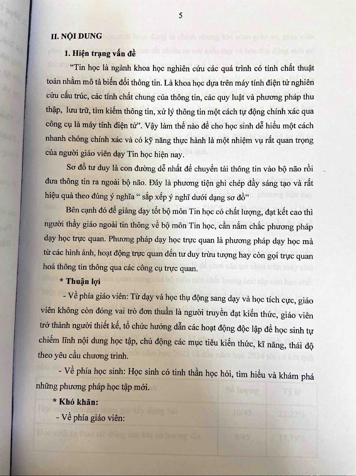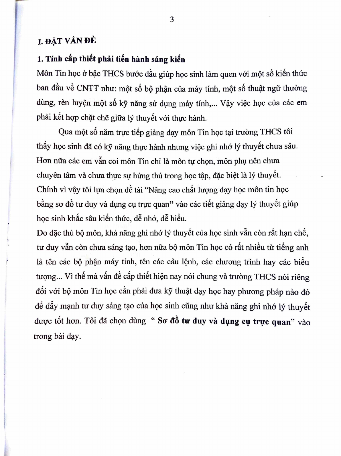 This academic initiative meticulously addresses the persistent challenges in Informatics education at the secondary school level, where students often exhibit limited theoretical recall, lack of creative thinking, and a perception of the subject as peripheral. The core objective is to significantly enhance the "chất lượng dạy học môn Tin học" by integrating advanced pedagogical tools. The paper systematically outlines the current state, identifying specific hurdles such as difficulty with abstract concepts and numerous English terminologies. To surmount these, two primary solutions are proposed and elaborated: the strategic application of "sơ đồ tư duy" (mind maps) and the comprehensive utilization of "dụng cụ trực quan" (visual aids). The methodology focuses on "trực quan hoá thông tin dạy học", transforming abstract data into tangible, memorable forms through images, sounds, models, and real-world objects. This approach is further bolstered by creating diverse visual stimuli, encompassing linguistic, graphic, and pictorial representations. "Sơ đồ tư duy" is presented as an exceptionally effective method for creative note-taking and information organization, aiding knowledge internalization. Meanwhile, visual aids, including diagrams of computer structures and icons for software functions, are detailed as crucial for facilitating quick understanding and practical skill acquisition. The integration of these techniques aims to foster a more engaging, interactive learning environment, significantly improving students' ability to recall theory, develop critical thinking, and cultivate a deeper interest in Informatics, thereby aligning with modern educational standards and curriculum requirements for THCS.