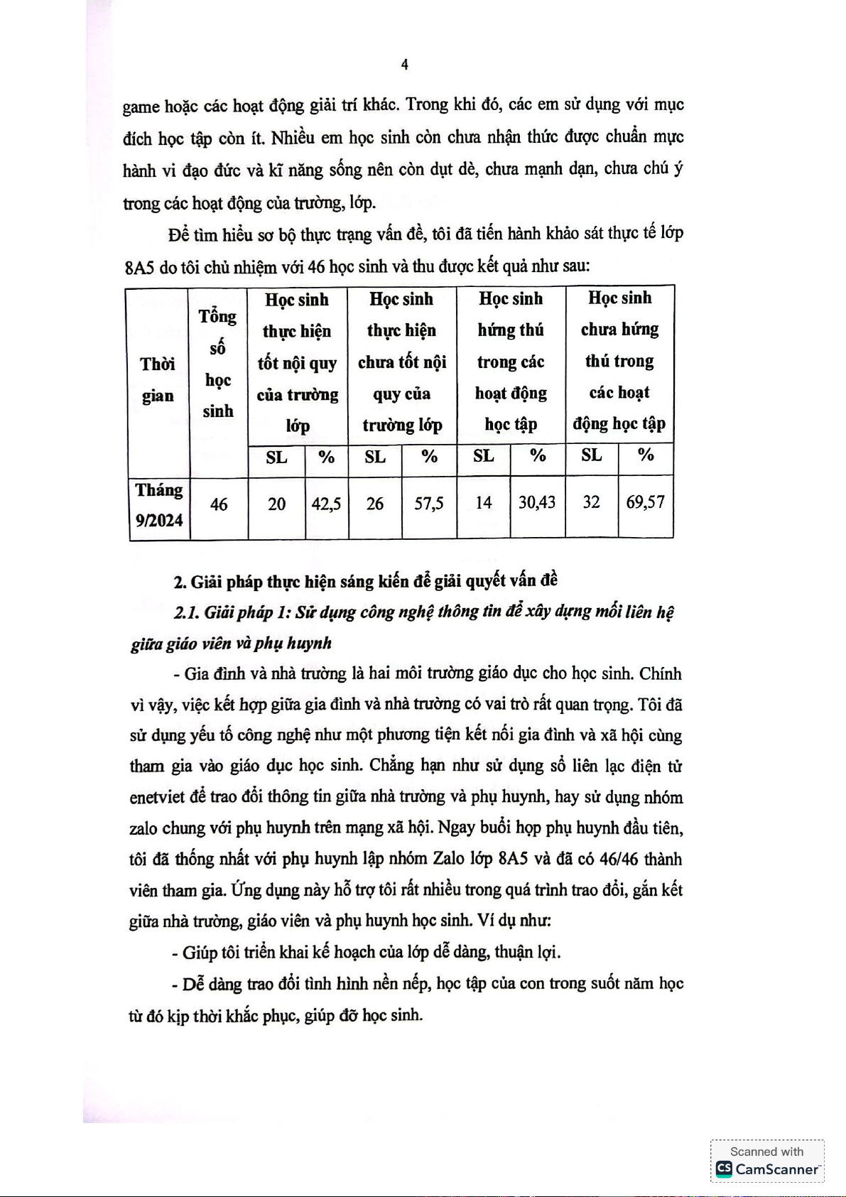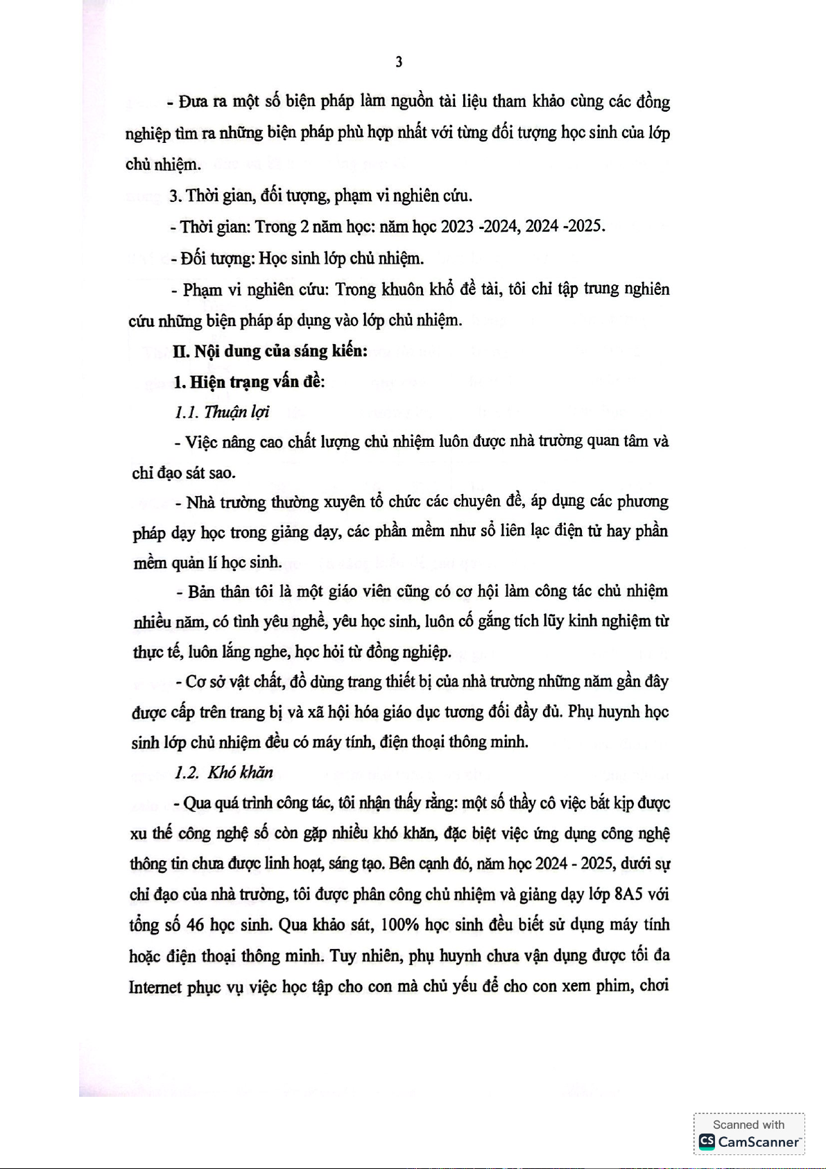 Sáng kiến tập trung vào việc khai thác tiềm năng của công nghệ số để hiện đại hóa công tác chủ nhiệm tại trường THCS. Nhận thấy những thách thức như việc một số giáo viên còn khó khăn trong việc thích ứng với công nghệ và phụ huynh chưa tận dụng tối đa công nghệ cho mục đích học tập của học sinh, đề tài đã đề xuất ba giải pháp trọng tâm. Thứ nhất, sáng kiến thúc đẩy việc xây dựng mối liên hệ chặt chẽ giữa giáo viên chủ nhiệm và phụ huynh thông qua các nền tảng kỹ thuật số như nhóm Zalo, Google Forms và sổ liên lạc điện tử Enetviet, đồng thời thiết lập các quy tắc rõ ràng để tối ưu hóa việc giao tiếp. Thứ hai, việc sử dụng các phần mềm chuyên biệt như Classdojo được giới thiệu để thiết lập nội quy lớp học một cách công bằng và minh bạch, cũng như quản lý hệ thống tính điểm thi đua và khen thưởng, khuyến khích tính tích cực và trách nhiệm của học sinh, đồng thời cho phép phụ huynh theo dõi tiến độ của con em. Cuối cùng, sáng kiến tích hợp các công cụ thiết kế như Canva và PowerPoint vào tiết sinh hoạt lớp, biến chúng thành những buổi học sôi động, hấp dẫn, khuyến khích học sinh chủ động chia sẻ và thể hiện bản thân, từ đó nâng cao hứng thú học tập và khả năng tương tác. Những giải pháp này không chỉ cải thiện hiệu quả quản lý lớp học mà còn tăng cường sự gắn kết giữa gia đình và nhà trường, góp phần vào chuyển đổi số trong giáo dục và đào tạo công dân số có năng lực số phù hợp với yêu cầu của thời đại công nghệ.