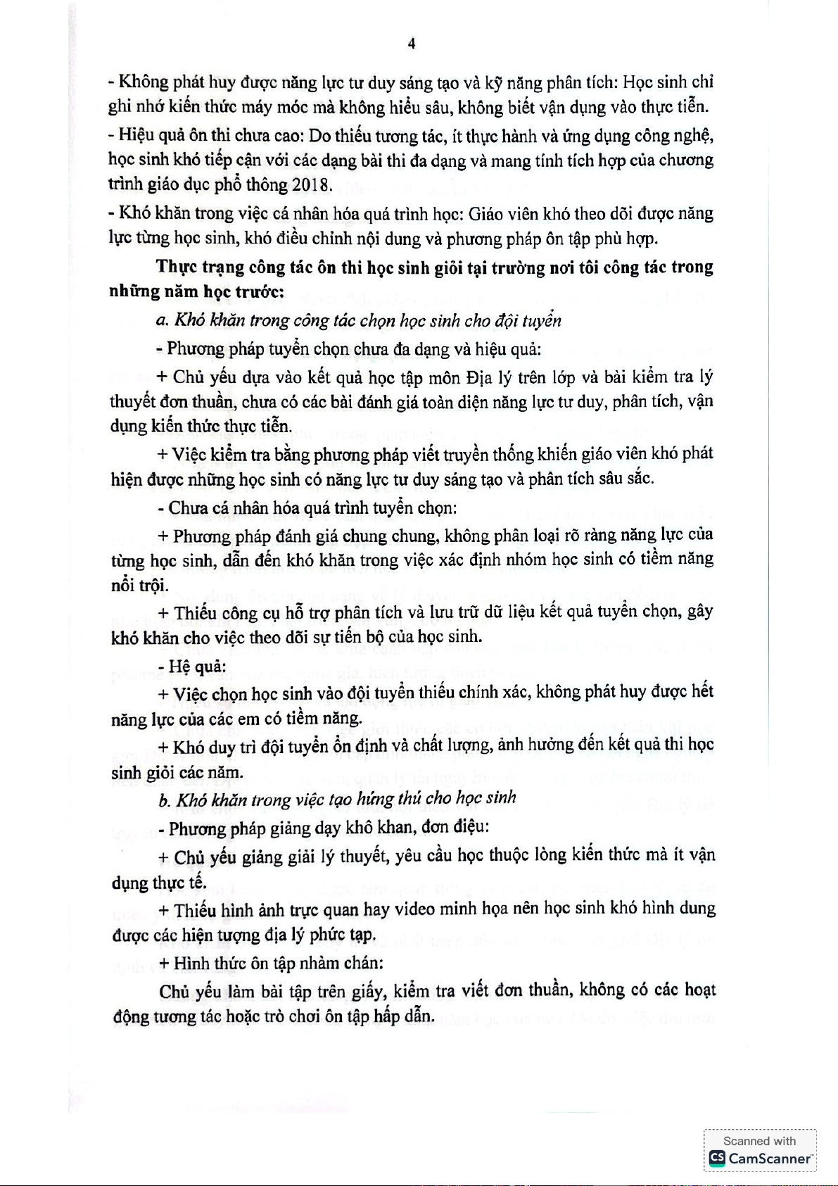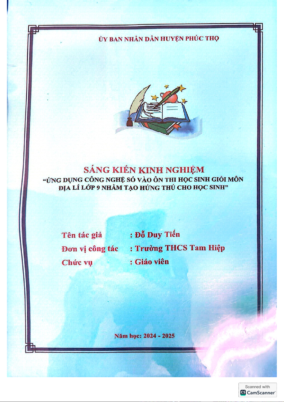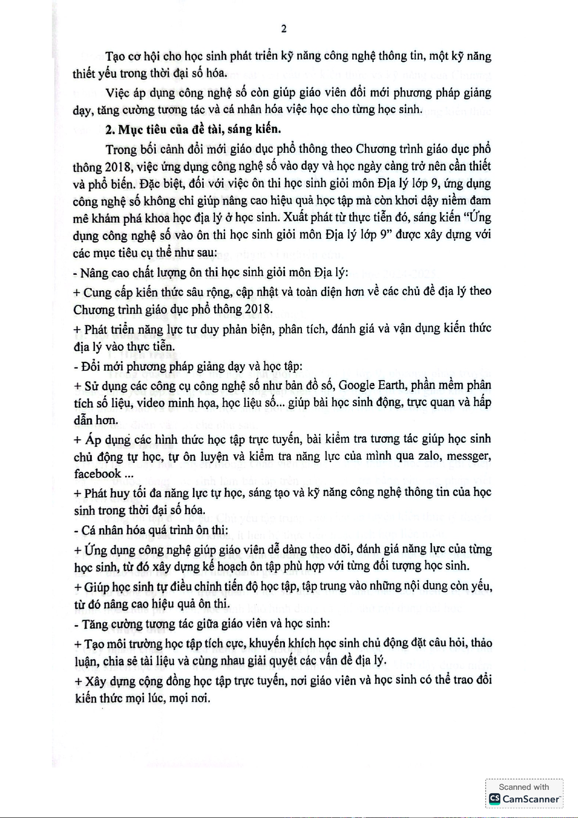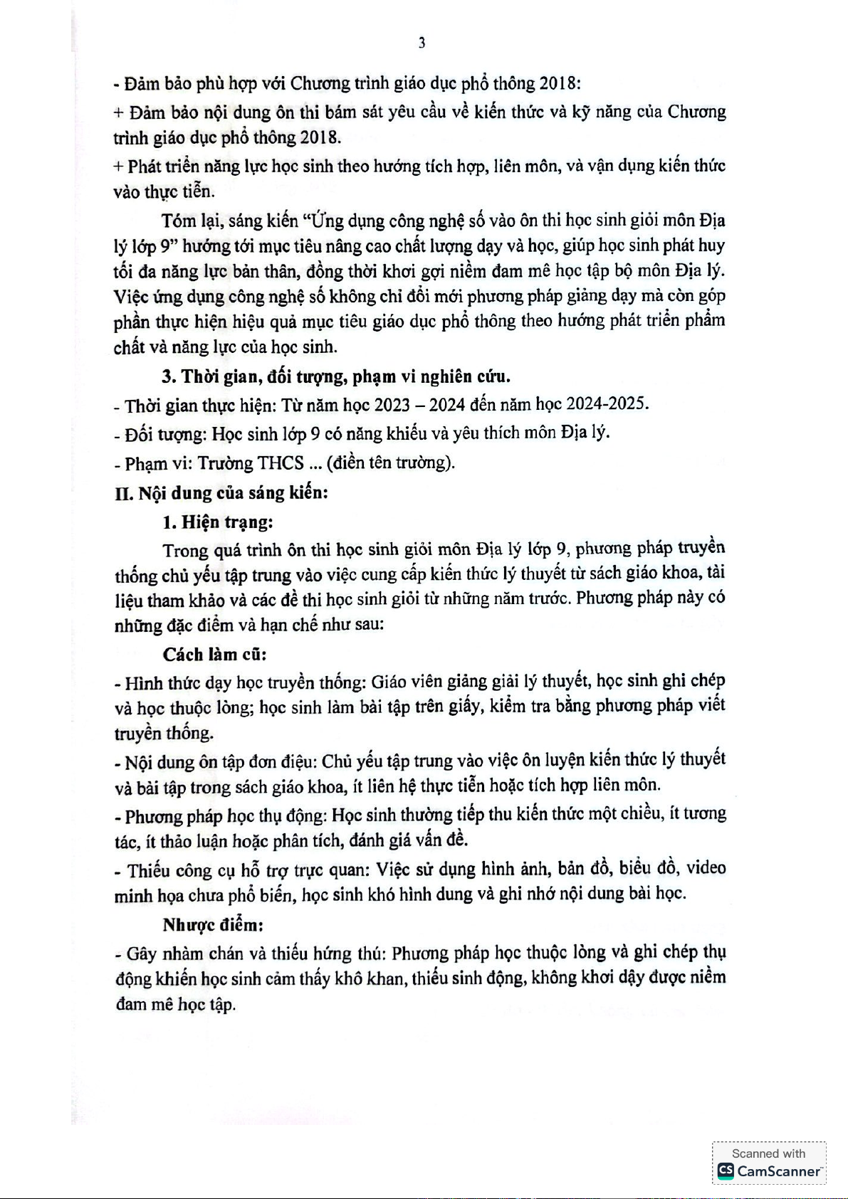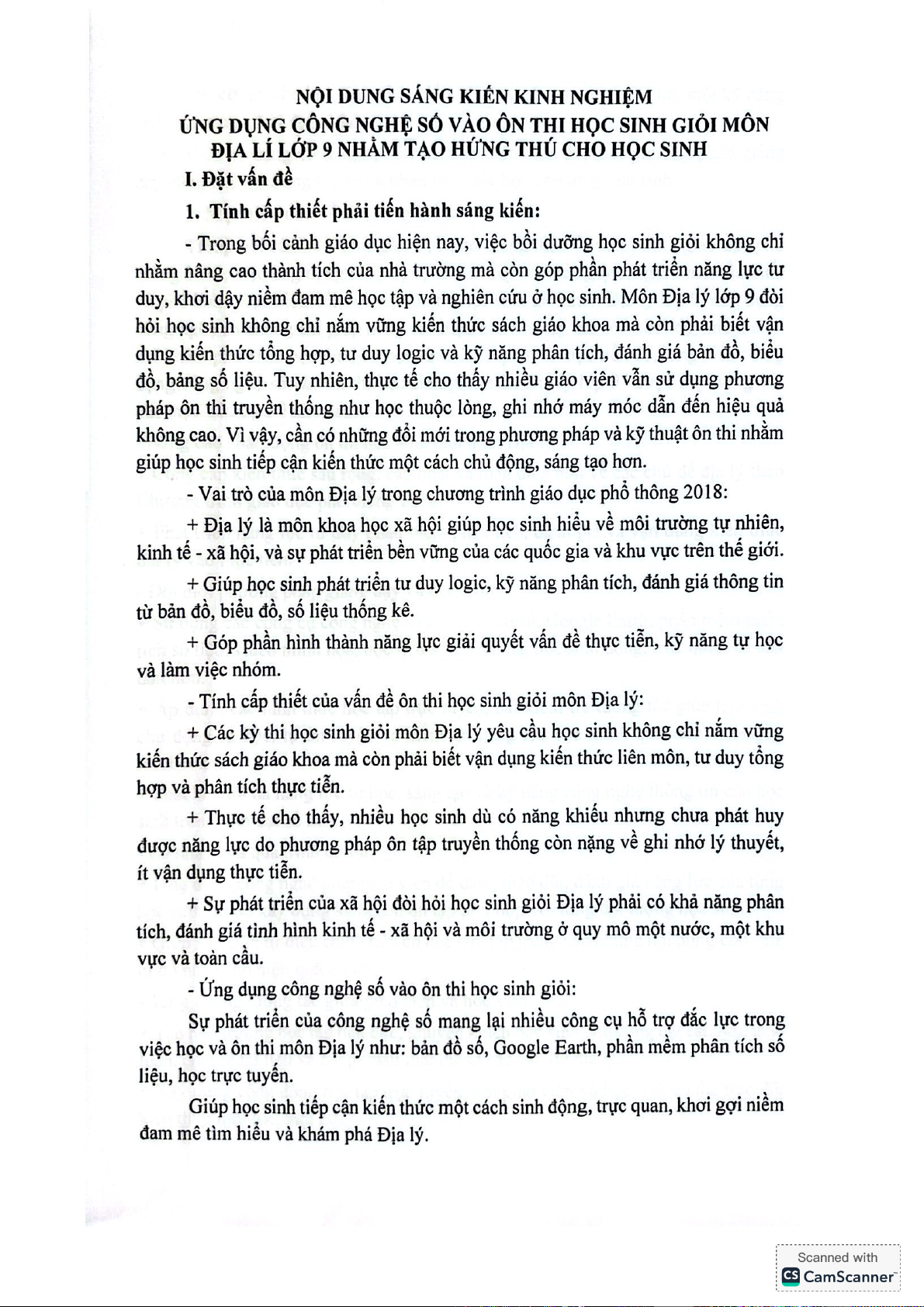 Trong bối cảnh giáo dục hiện đại, việc bồi dưỡng học sinh giỏi không chỉ là nâng cao thành tích mà còn thúc đẩy năng lực tư duy, niềm đam mê học tập. Đặc biệt, môn Địa lý lớp 9 đòi hỏi học sinh không chỉ nắm vững kiến thức sách giáo khoa mà còn phải biết vận dụng tư duy tổng hợp và kỹ năng phân tích thực tiễn. Tuy nhiên, phương pháp ôn thi truyền thống thường khô khan, thiếu tương tác, chưa phát huy được tối đa tiềm năng của học sinh. Sáng kiến này ra đời nhằm giải quyết vấn đề đó thông qua việc ứng dụng công nghệ số vào quá trình ôn thi, với mục tiêu nâng cao chất lượng học tập, đổi mới phương pháp giảng dạy và học tập, cá nhân hóa quá trình ôn thi và tăng cường tương tác, từ đó khơi gợi hứng thú và phát triển toàn diện năng lực cho học sinh giỏi môn Địa lý.