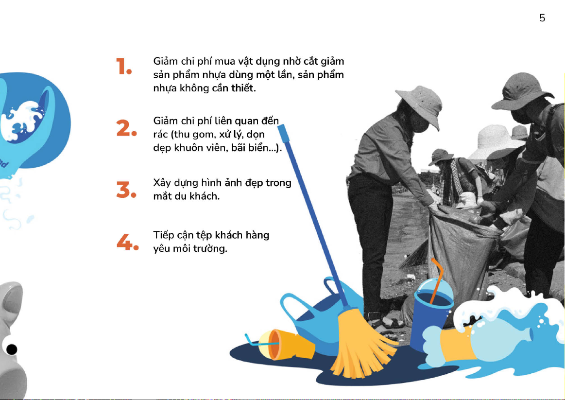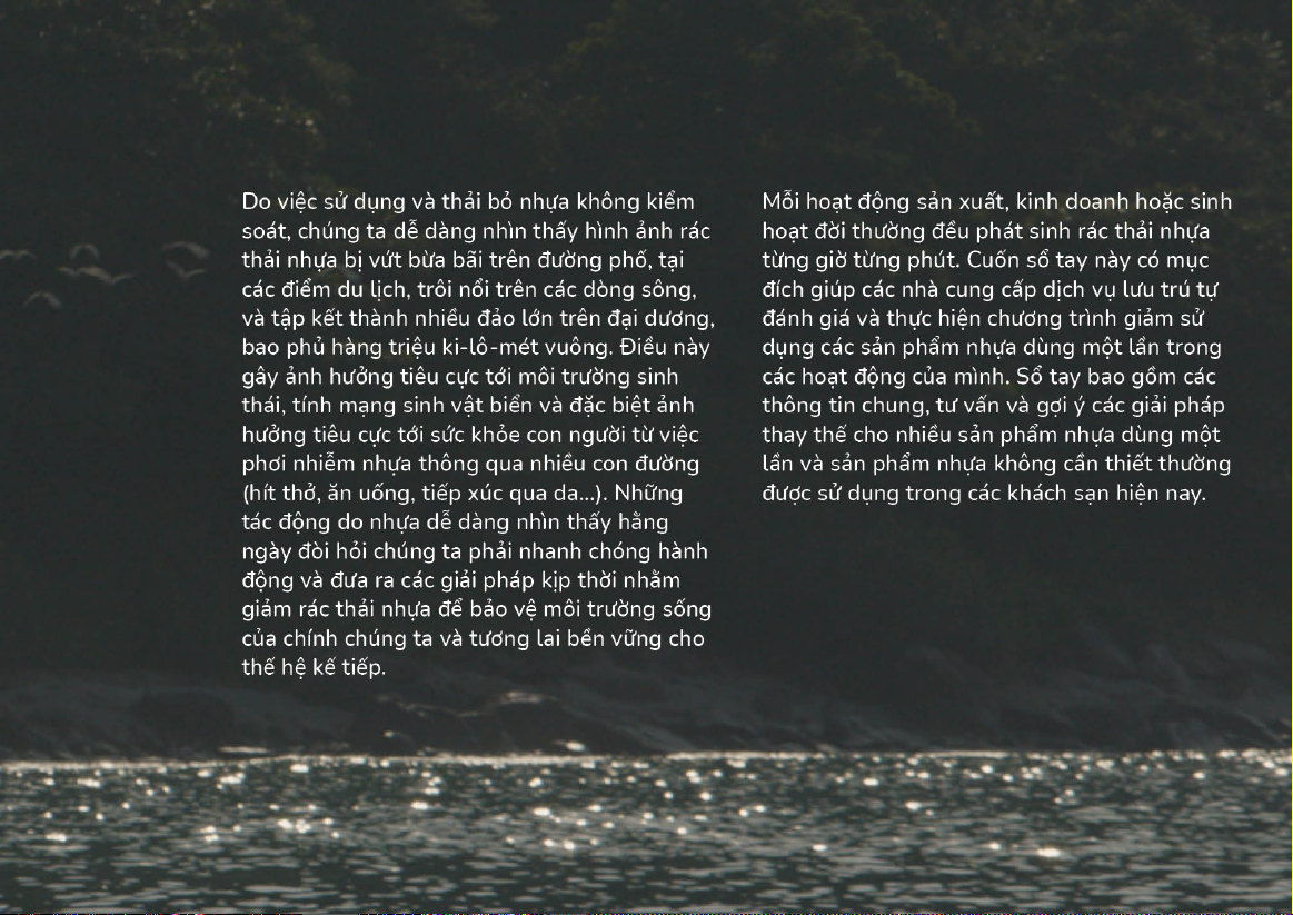 Sổ tay hướng dẫn giảm nhựa cho dịch vụ lưu trú, du lịch: phân loại nhựa, tác động ô nhiễm, giải pháp giảm thiểu, kinh nghiệm thực tiễn.