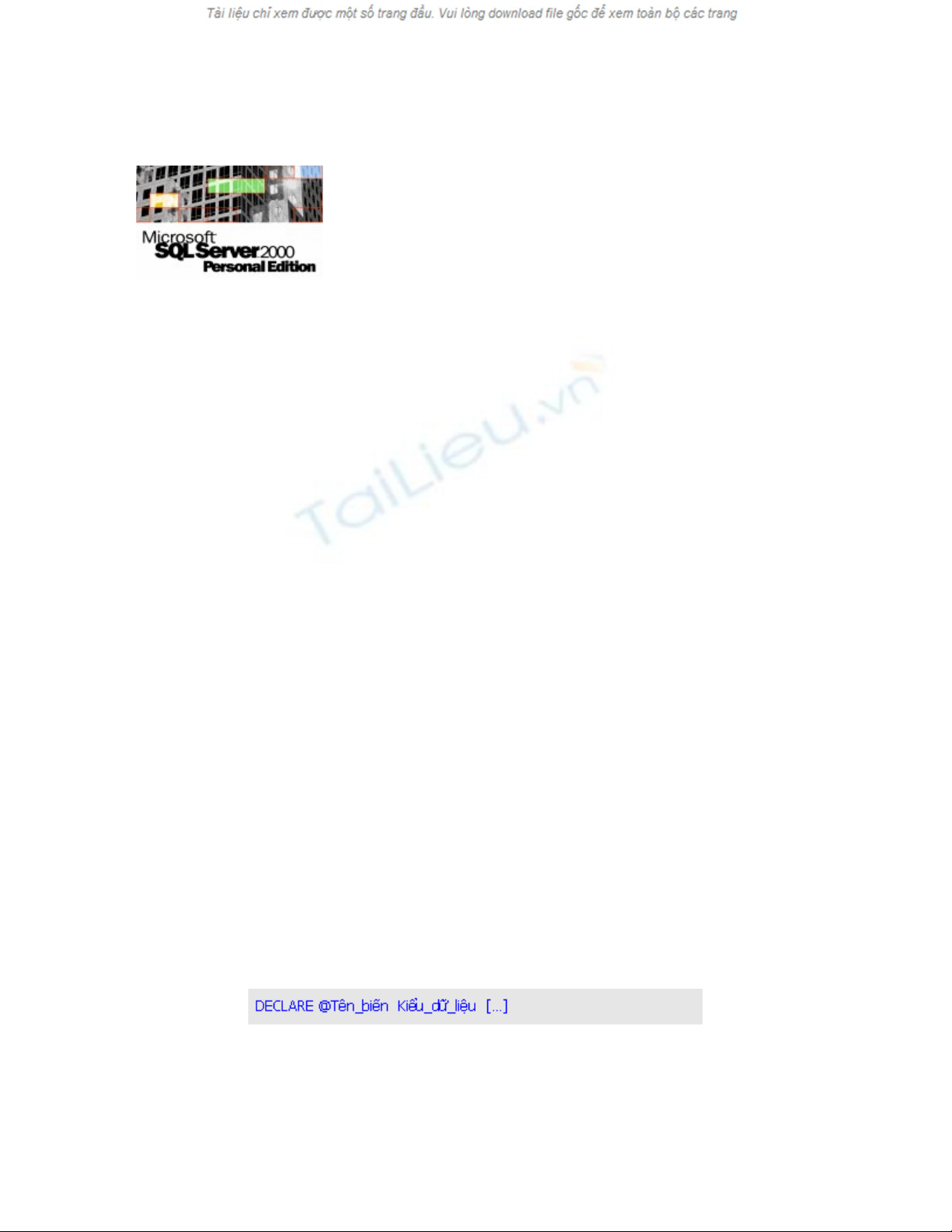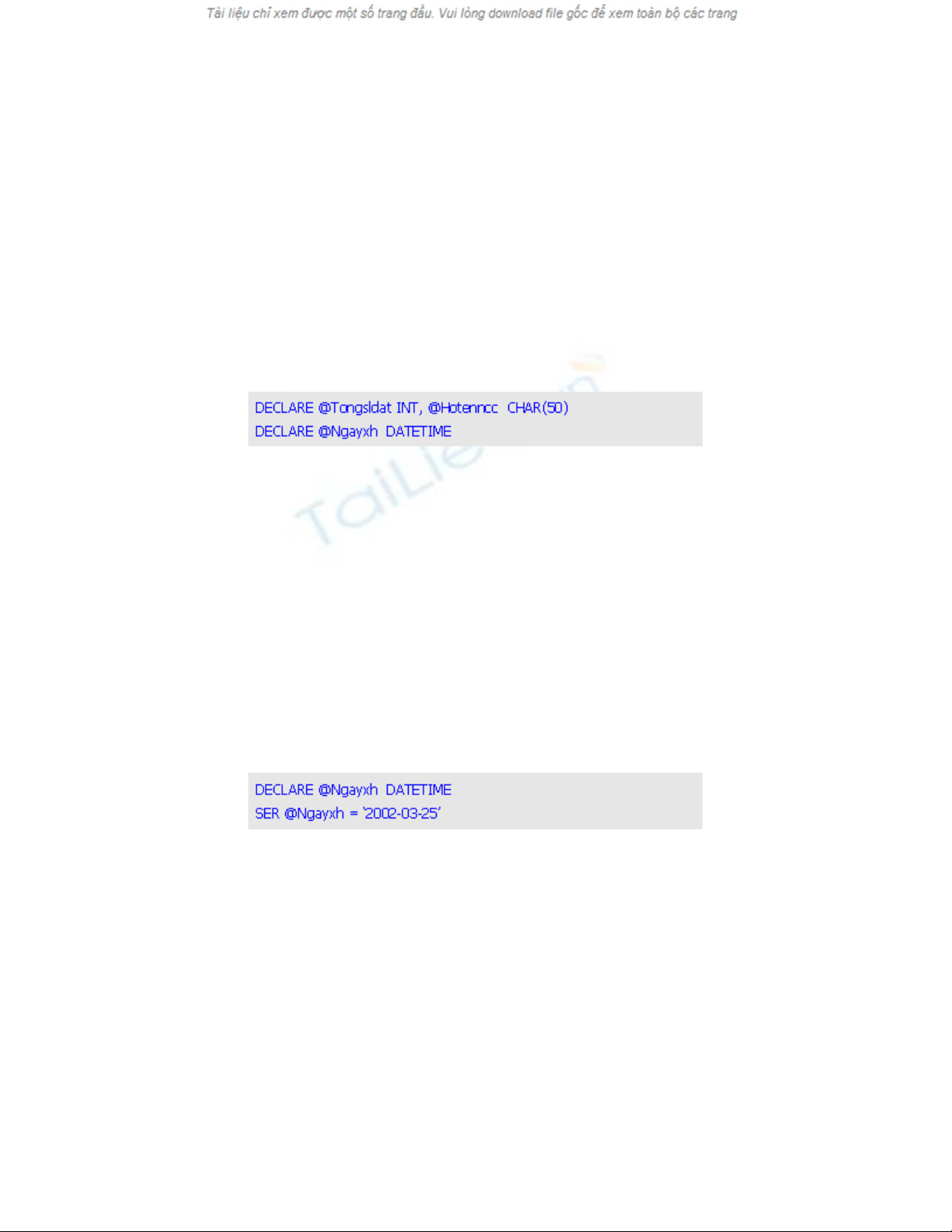 Đ khai báo bi n c c b trong Transaction-SQL, b n s d ng l nh ể ế ụ ộ ạ ử ụ ệ DECLARE v i cúớ
