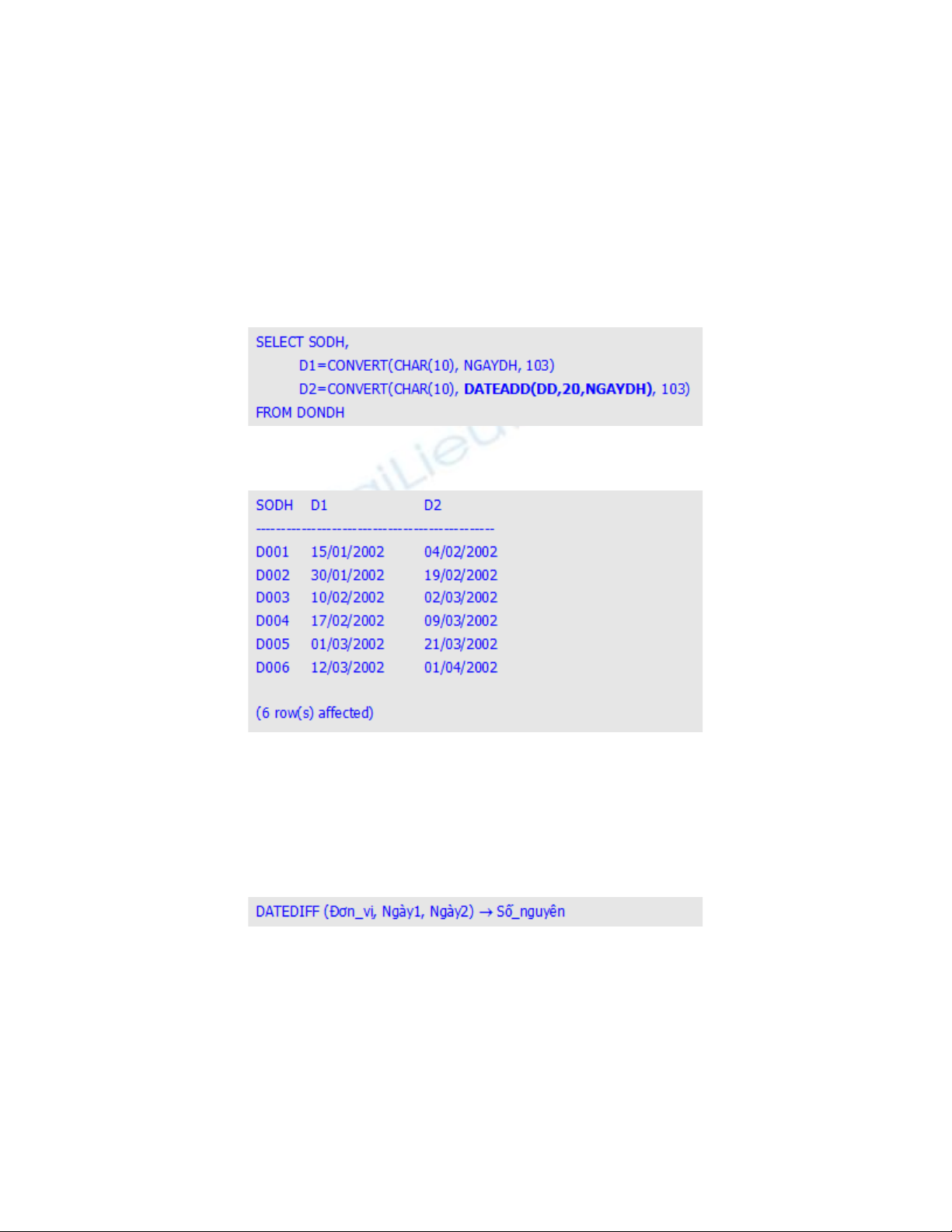 V i cú pháp hàm DATEDIFF bên d i có k t qu tr v là m t s nguyên, nói lênớ ướ ế ả ả ề ộ ố