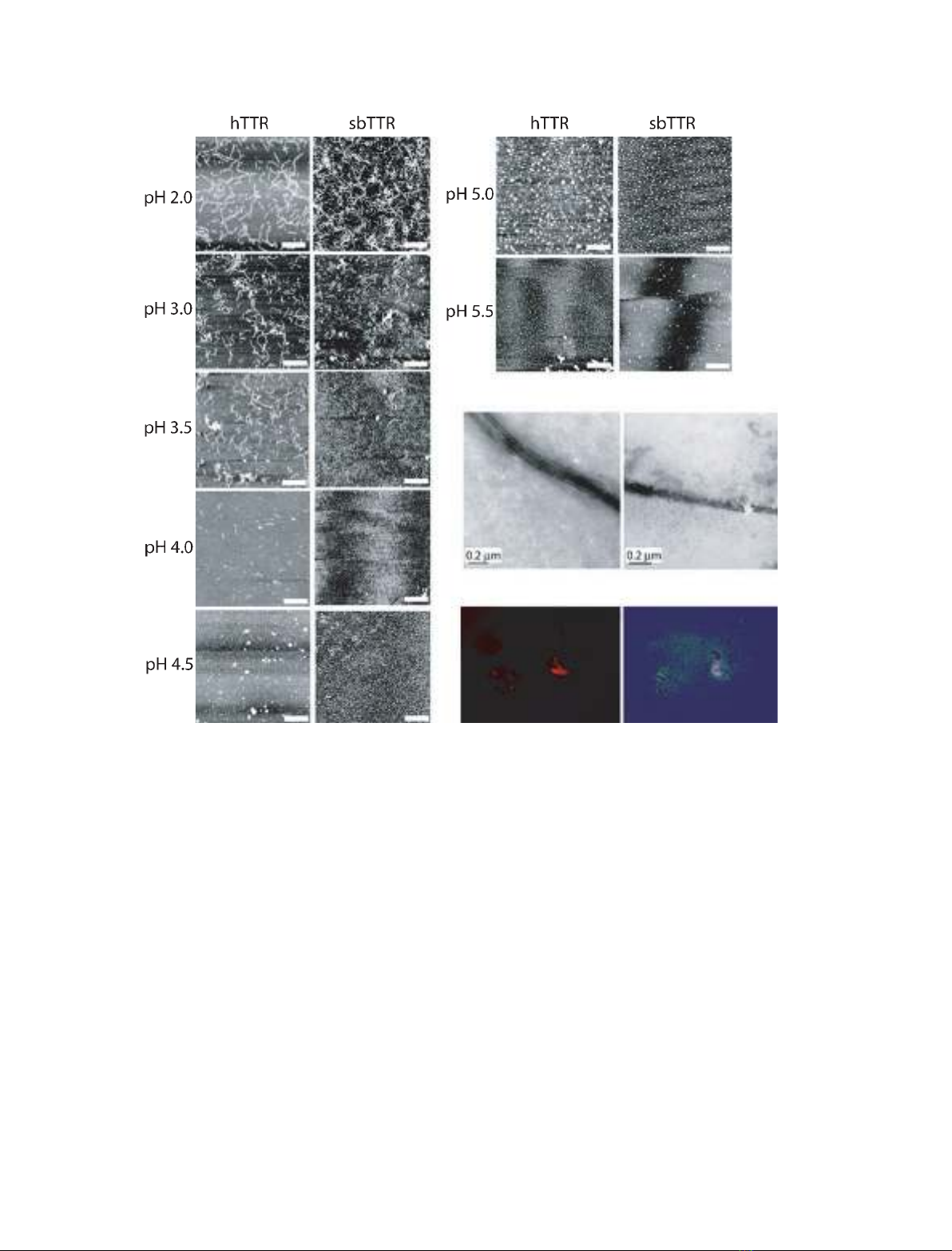 sbTTR displayed fibrils at pH 2.0–3.5 that were very