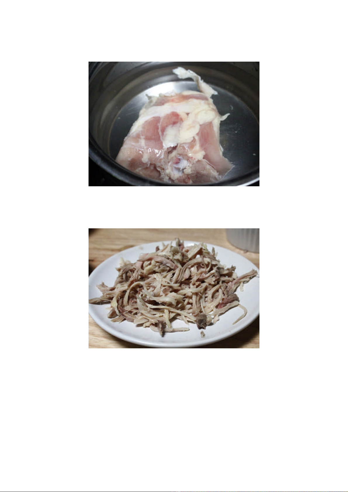 - Thịt gà sau khi luộc chín, dùng tay xé thành từng sợi nhỏ.