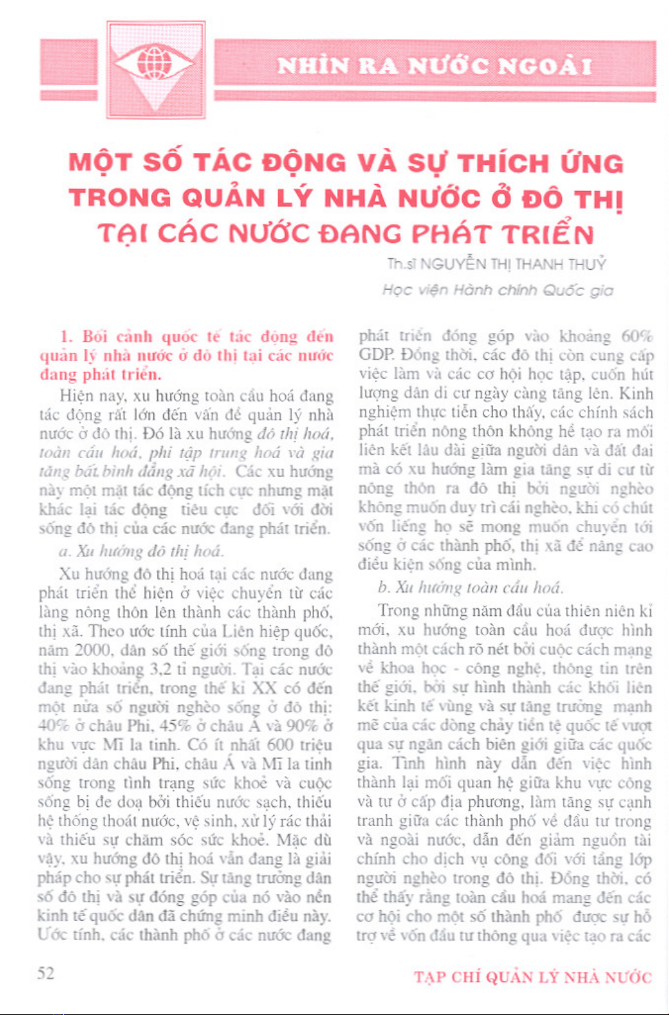 Một số tác động và sự thích ứng trong quản lý nhà nước ở đô thị tại các nước đang phát triển - ThS. Nguyễn Thị Thanh Thủy