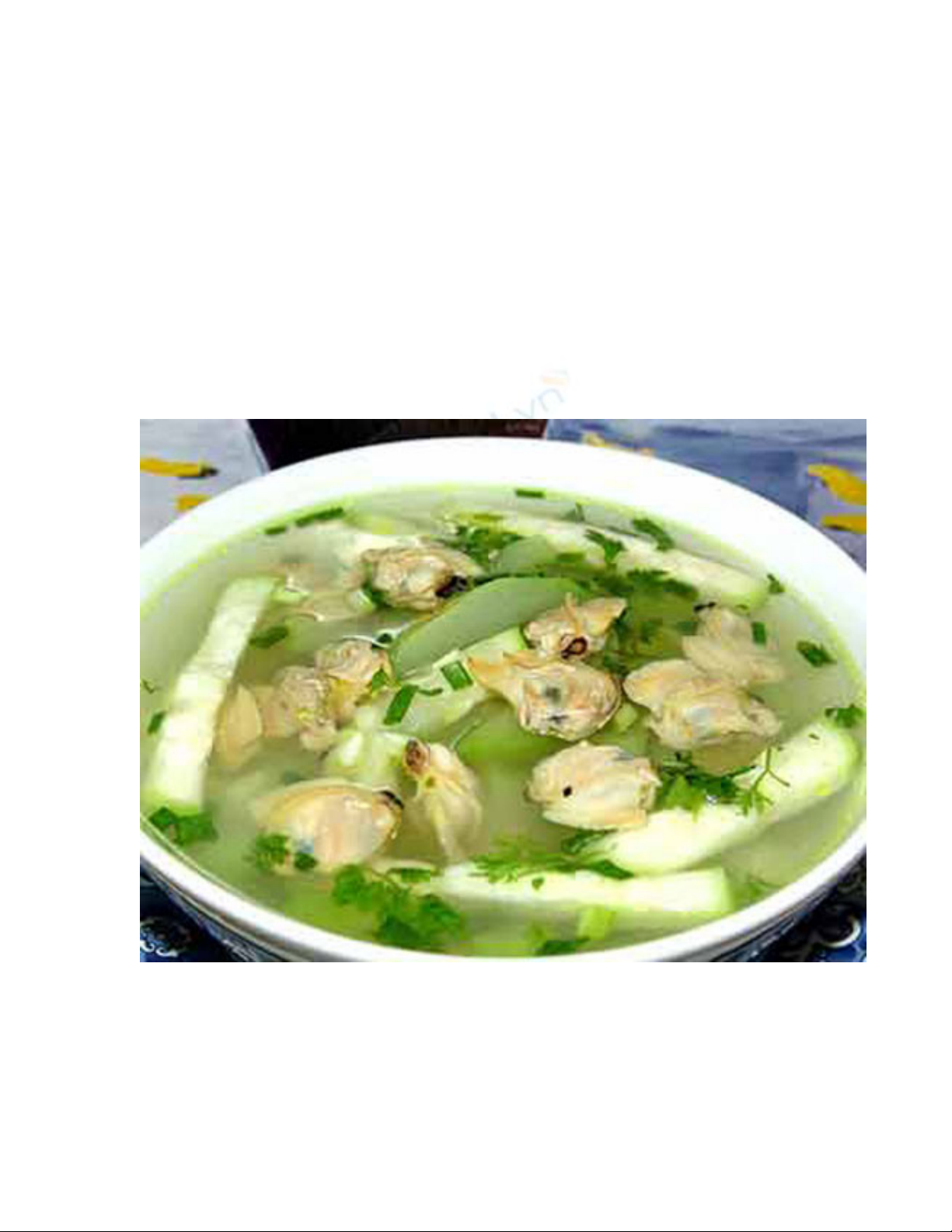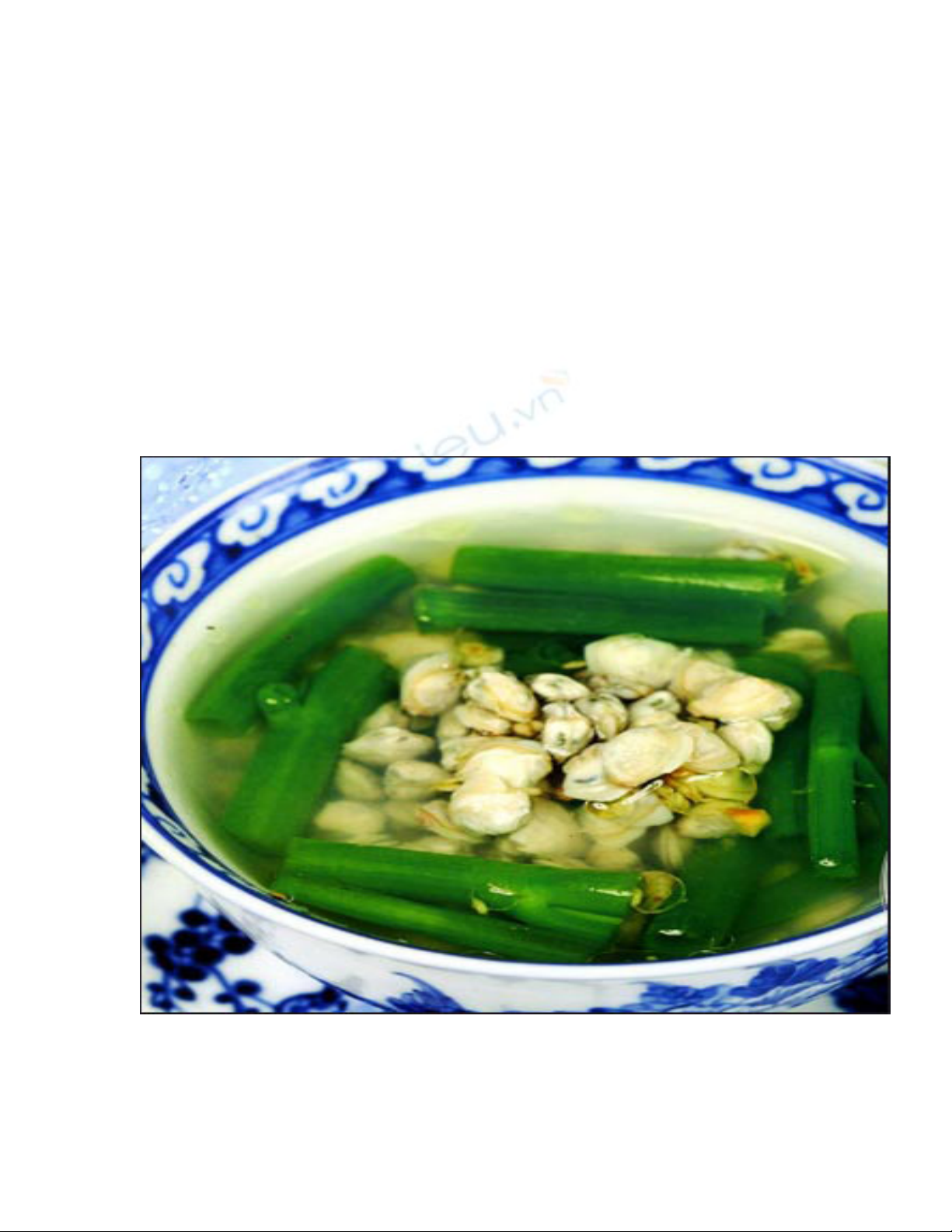 hẹ 3g, gia vị vừa đủ. Sò, hến đem rửa sạch, hấp cách thủy rồi bỏ vỏ, ruột thái