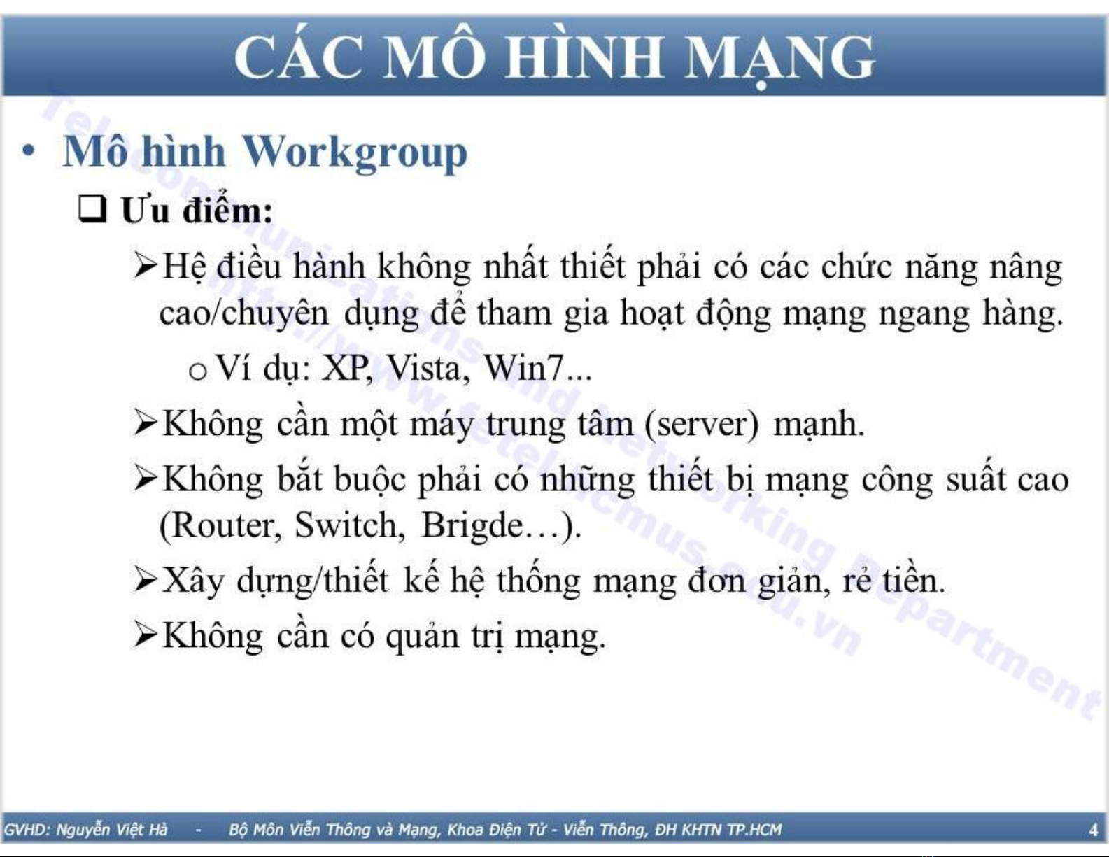 Hệ điều hành không nhất thiết phải có các chức năng nậng cao/ chuyên dụng để tham gia hoạt động mạng ngang hàng. Không cần một máy trung tâm mạnh không bắt buộc phải có những thiết bị mạng công suất cao xây dựng, thiết kế hệ thống mạng đơn giản , rẻ tiền...