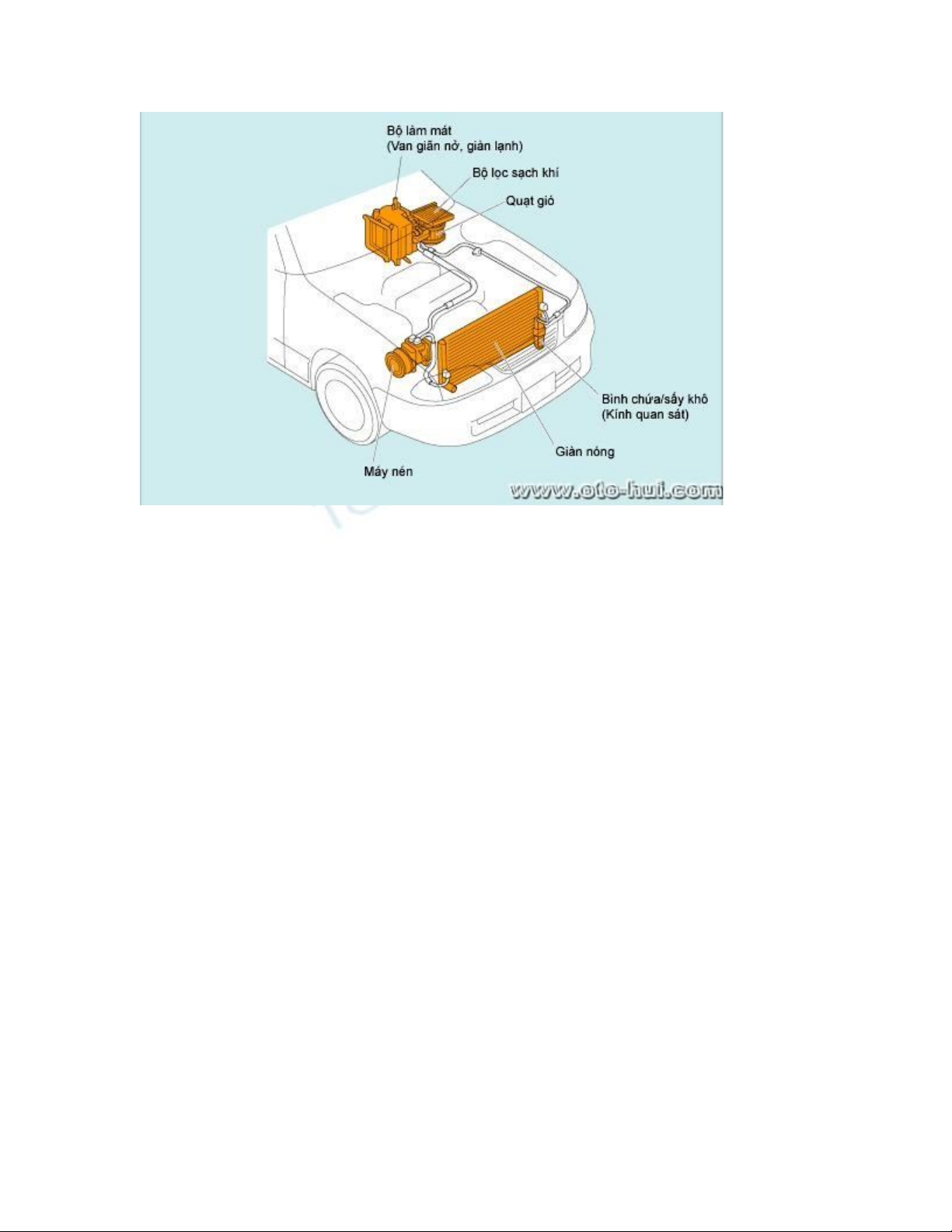 Bộ phận cơ bản của hệ thống làm lạnh của ô tô gồm có: Máy nén, giàn nóng, bình