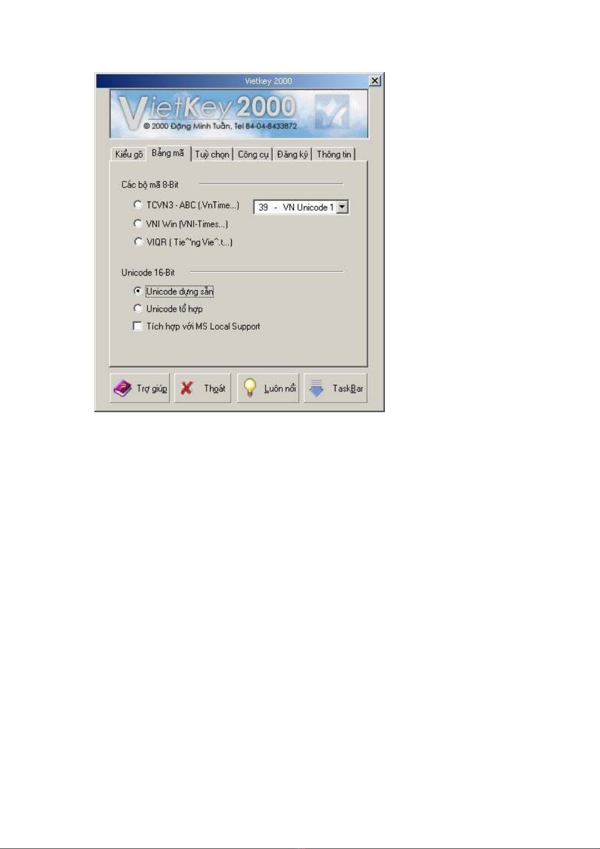 Thực hiện cấu hình như dưới đây để gõ Unicode bằng bộ gõ VietKey2000: