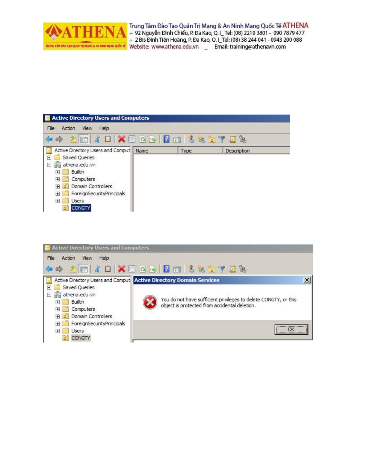 Trong Active Directory Users and Computers, xóa thử OU CONGTY và thấy thông báo lỗi