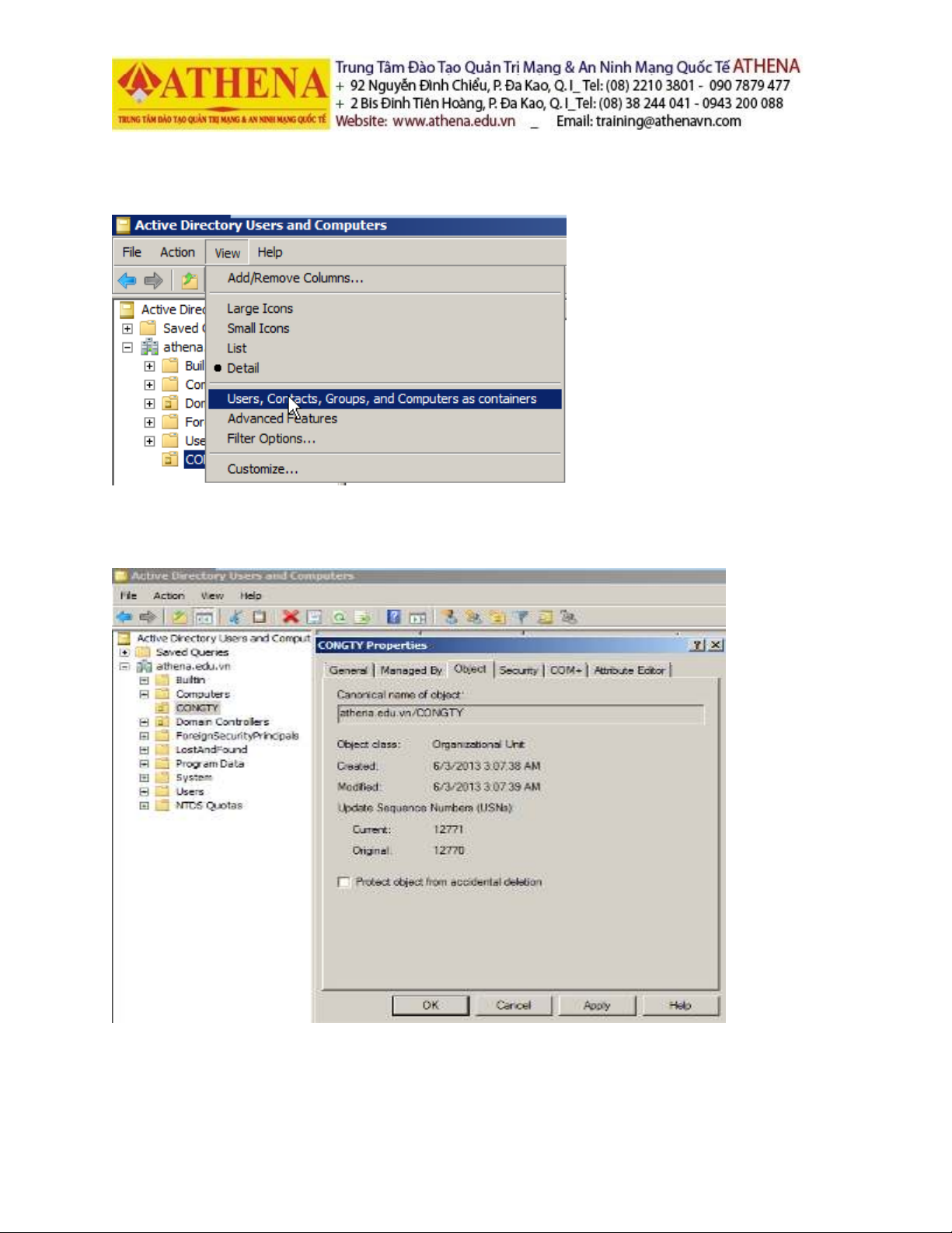 Để xóa thành công OU CHA, trong Active Directory Users and Computers ta sẽ chọn View
