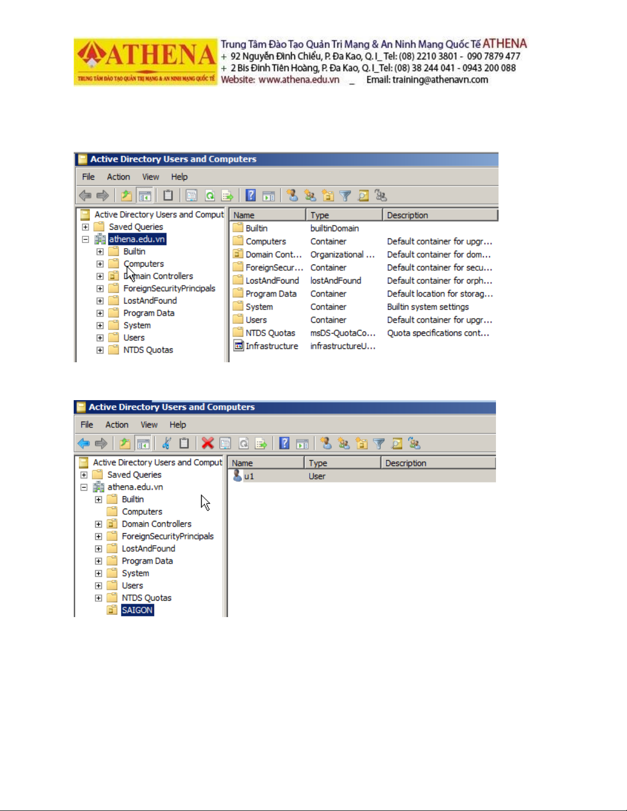 Bước 2(tạo OU với tên SAIGON và thêm user u1 vào OU này):