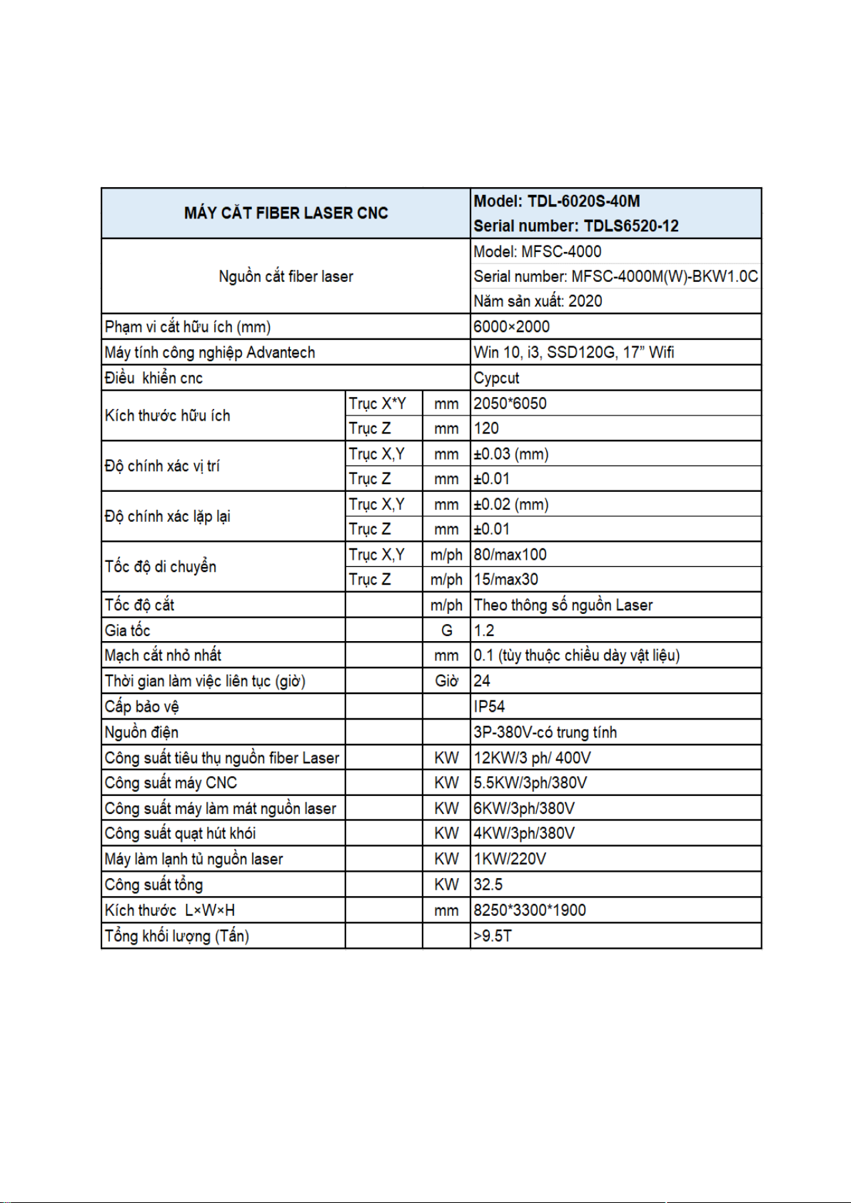 Bảng 1: Thông số kỹ thuật cơ bản máy Fiber Laser CNC 6020