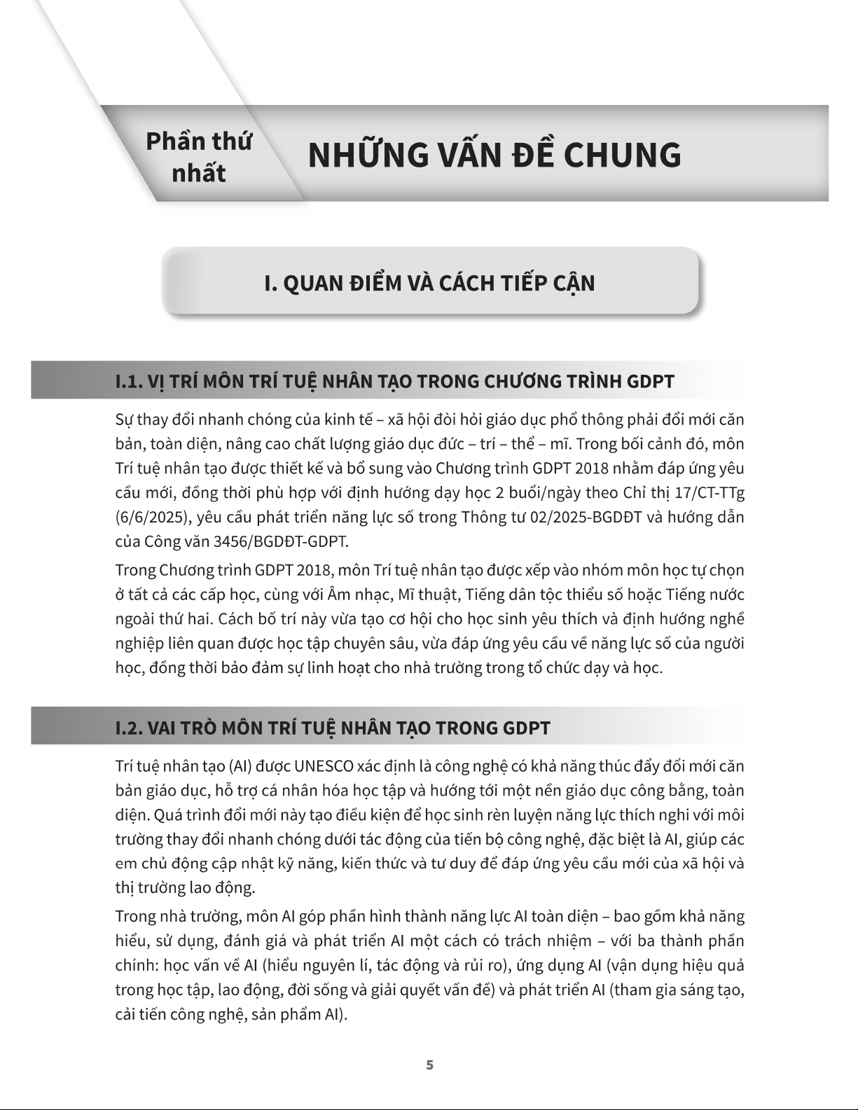 Trong bối cảnh toàn cầu hóa và sự phát triển nhanh chóng của công nghệ, đặc biệt là trí tuệ nhân tạo (AI), việc đổi mới giáo dục phổ thông trở nên cấp thiết hơn bao giờ hết. Tài liệu này nhấn mạnh tầm quan trọng của việc tích hợp môn Trí tuệ nhân tạo vào chương trình giáo dục phổ thông (GDPT) 2018, nhằm trang bị cho học sinh những kiến thức và kỹ năng cần thiết trong kỷ nguyên số. Môn học không chỉ cung cấp nền tảng về AI mà còn bồi dưỡng tư duy phản biện, sáng tạo và năng lực số toàn diện, giúp thế hệ trẻ thích ứng và phát triển trong một xã hội đang thay đổi liên tục. Mục tiêu là định hướng học sinh sử dụng AI một cách an toàn, đạo đức và có trách nhiệm.
