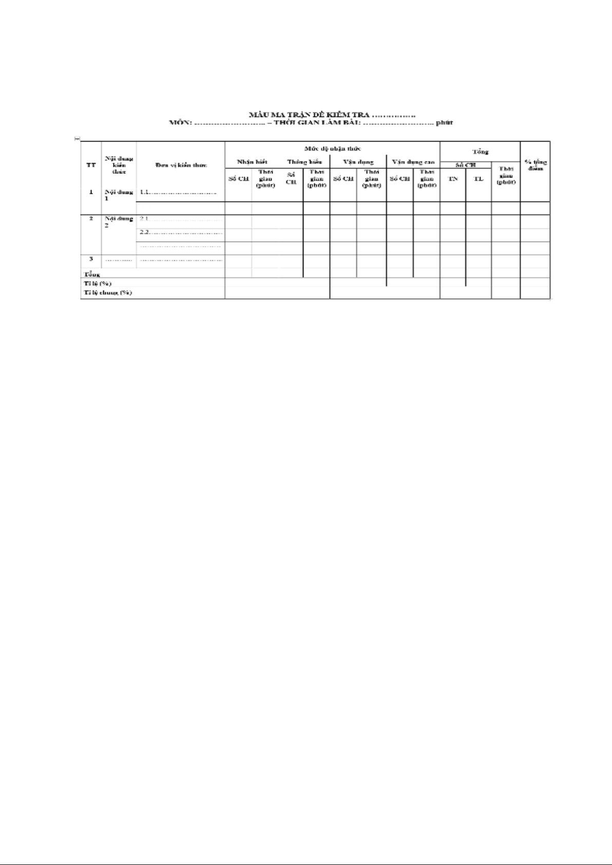 Cấu trúc một bảng ma trận đề kiểm tra