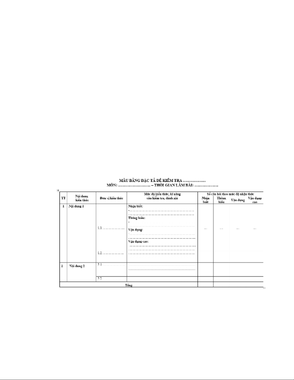Ví dụ minh họa mẫu bản đặc tả đề kiểm tra