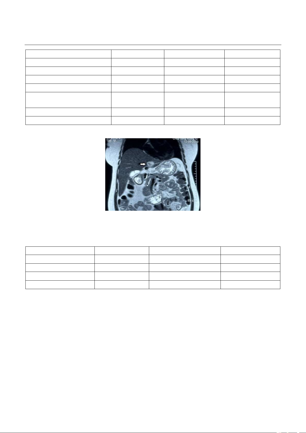 Tên xét nghiệm Kết quả Giá trị tham chiếu Đơn vị Noradrenaline niệu 24h 106,6 0-90 µg/24h Dopamin niệu 24h 1040 0-600 µg/24h Cortisol 8h 239 166-507 nmol/L ACTH 6,91 7,2-63,3 pg/mL Nghiệm pháp dexamethasone 1mg qua đêm (xét nghiệm cortisol) 195 < 50 nmol/L Glucose đói 5,9 → 6,39 3,9-5,6 mmol/L Kali máu 4,8 3,5-5 mmol/L Khối u gan (Tăng sản thể nốt khu trú - Focal Nodular Hyperplasia) Hình 6. MRI ổ bụng u gan: Hình ảnh tăng sản thể nốt khu trú (Focal Nodular Hyperplasia - FNH) hạ phân thùy II của gan kích thước 2323mm, bờ đều, giảm tín hiệu trên T1W, tăng tín hiệu trên T2W, tăng tín hiệu trên DW1, sau tiêm ngấm thuốc khá đồng nhất, không thấy thải thuốc ở thì muộn. Bảng 4. Các xét nghiệm liên quan khối u gan Tên xét nghiệm Kết quả Giá trị tham chiếu Đơn vị HbsAg Âm tính Âm tính Âm tính HCV Âm tính Âm tính Âm tính AFP 2,27 0,73-7,28 IU/mL PIVKA-II 34,68 0-40 mAU/mL Tổng kết lại, chúng tôi ghi nhận những vấn đề ở BN này như sau: U tuyến yên tiết prolactin, u vùng cổ đã phẫu thuật chưa rõ bản chất, cường cận giáp nguyên phát, u tụy, tăng sản tuyến thượng thận dạng nốt lớn hai bên nguyên phát tự động tiết cortisol, tăng sản thể nốt khu trú ở gan. Các dữ liệu thu được hướng đến bệnh cảnh lâm sàng của hội chứng MEN1. Kết quả xét nghiệm gen của BN Phát hiện 01 biến thể được phân lớp gây bệnh trên gen MEN1 (dạng di truyền trội, dị hợp). 2.2. Quá trình điều trị Sau khi đã chẩn đoán xác định hội chứng MEN1, bệnh nhân đã được điều trị nội khoa, phẫu thuật cắt khối u tụy và cắt tuyến thượng thận Trái, cụ thể như sau: