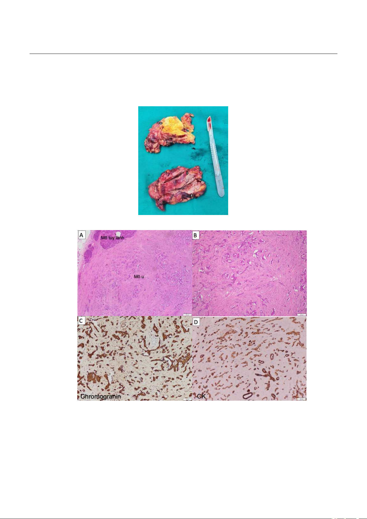 Hình 8. Hình ảnh mô bệnh học khối u tụy thần kinh nội tiết độ 2 và hóa mô miễn dịch Hình ảnh mô bệnh học mô u và mô tụy lành (A, HE x 10). Hình ảnh mô u tụy gồm các dây, dải tế bào u trên nền mô đệm xơ hoá (B, HE x 100). Hình ảnh nhuộm hoá mô miễn dịch các tế bào u dương tính với dấu ấn Chromogranin (C x 200) và dương tính với dấu ấn CK (D x 200).