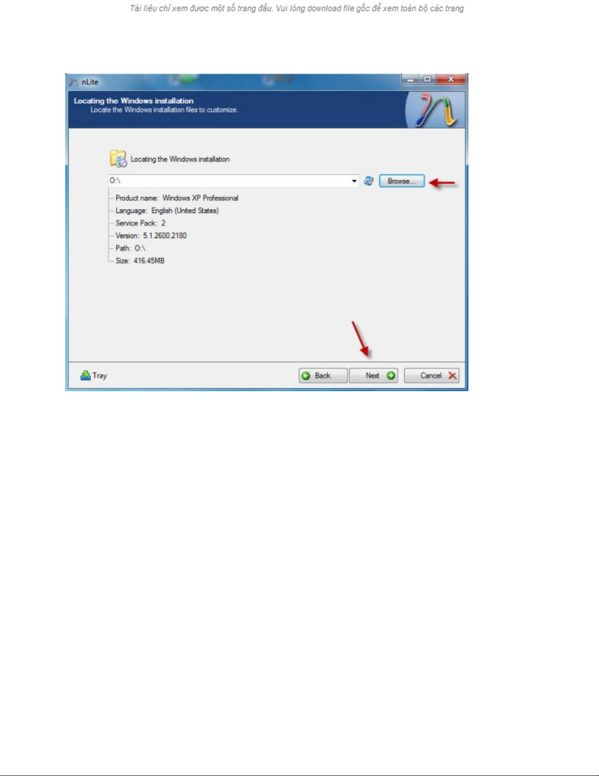 - Sau khi chọn đúng nơi lưu trữ, nLite sẽ hiển thị thông tin cụ thể về bản Windows này. Bấm Next để chuyển
