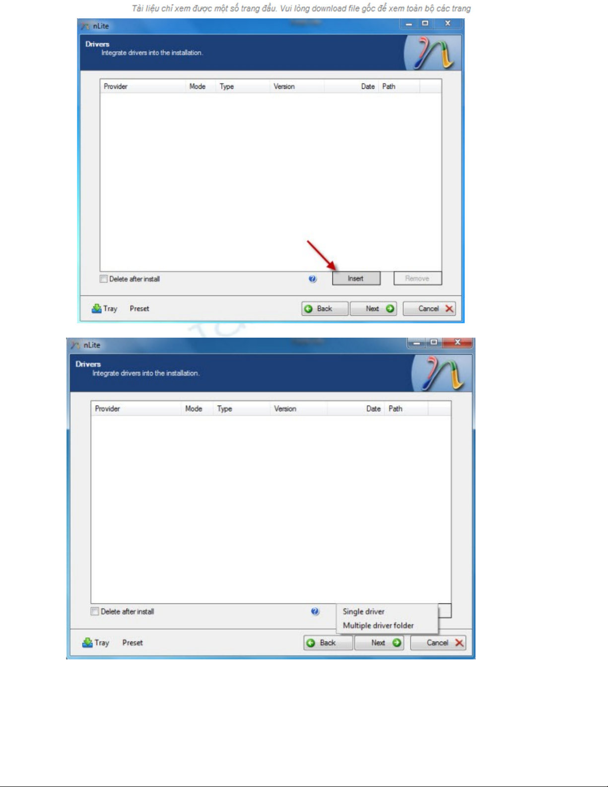 - Tại bước tiếp theo, bấm Insert để thêm driver, sẽ có 2 sự lựa chọn: Single driver và Multiple driver folder: