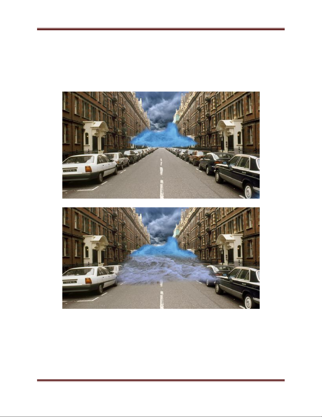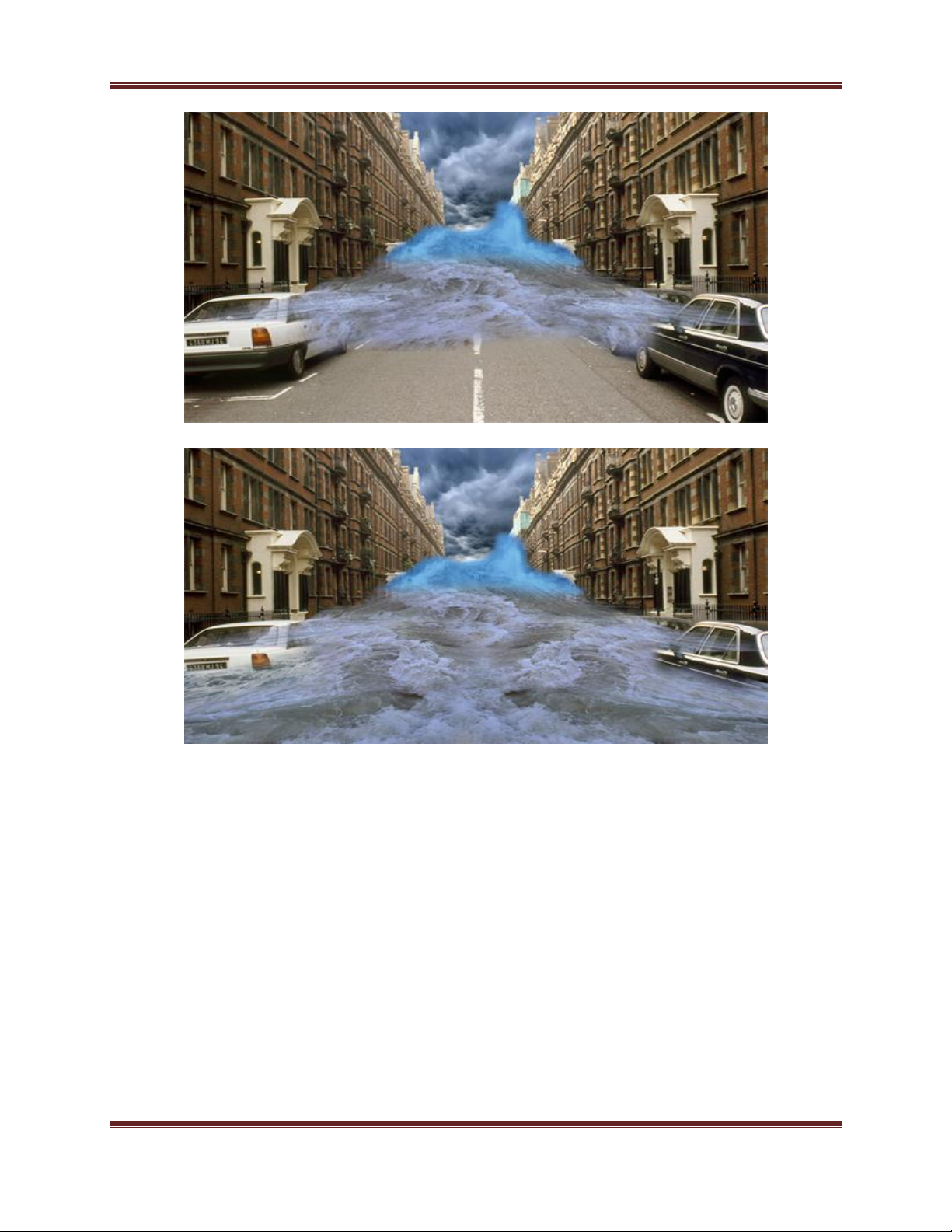 sóng thần với các đối tượng bị cuốn đi (như xe hơi, bức tường,