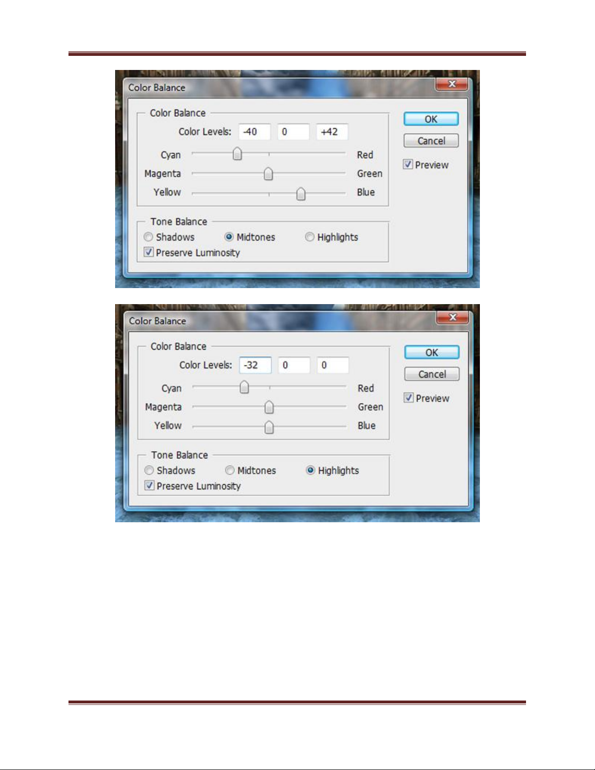 Balance, thiết lập các giá trị thuộc mục Midtones vàHighlights như
